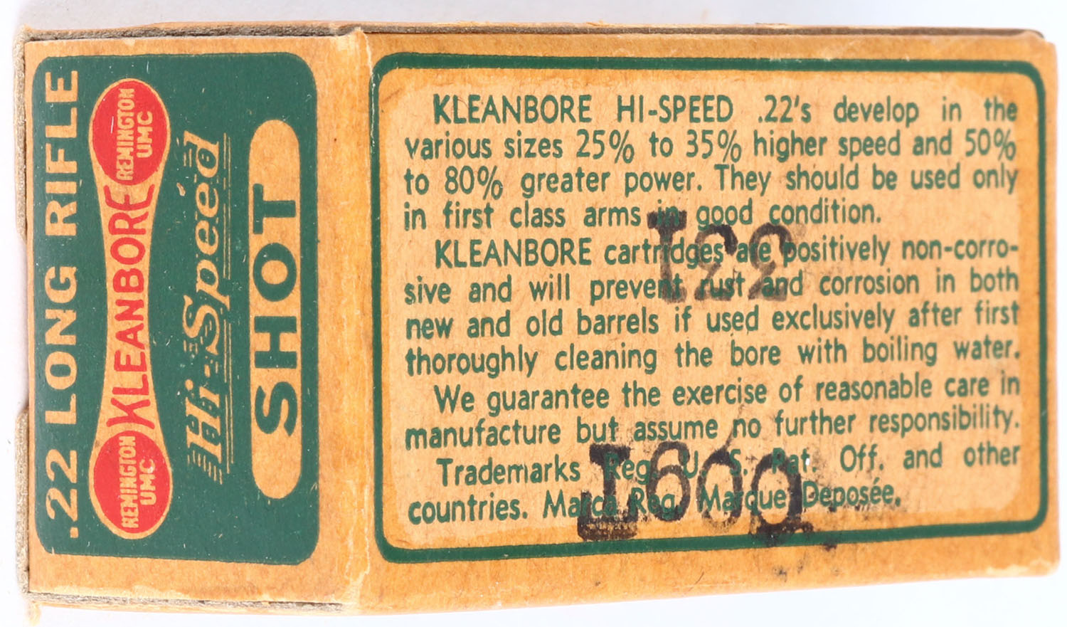 Remington, Hi-Speed Kleanbore, .22 Long Rifle Shot, RHWeb: REM-7.4 LR-4c, Full, 1pc. Green & buff dog bone box, box is solid with excellent color, very small stain on top, corners are mostly sharp, edges are crisp, end flaps are solid, ammo is excellent. Grade: Excellent ++ - Value: 20 to 60