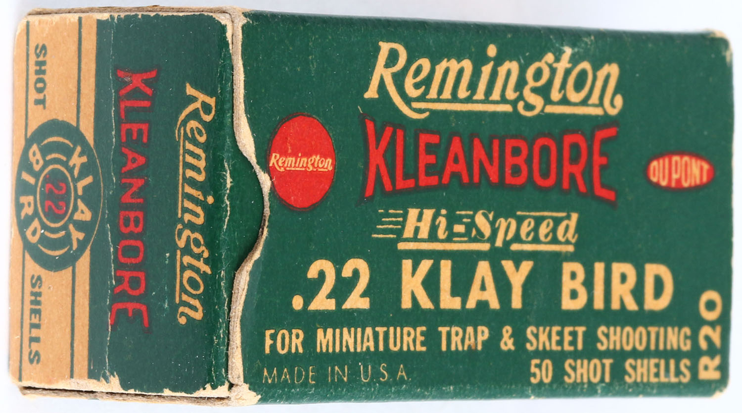 Remington, Kleanbore Hi-Speed, .22 Klay Bird, Long Rifle Shot, RHWeb: REM-10 LR-3a, Full, 1pc. Green white & red box, box is solid with excellent color, very minor age soiling, some corner wear, edges are mostly crisp, end flaps are rigid, ammo is excellent. Grade: Excellent + - Value: 30 to 90