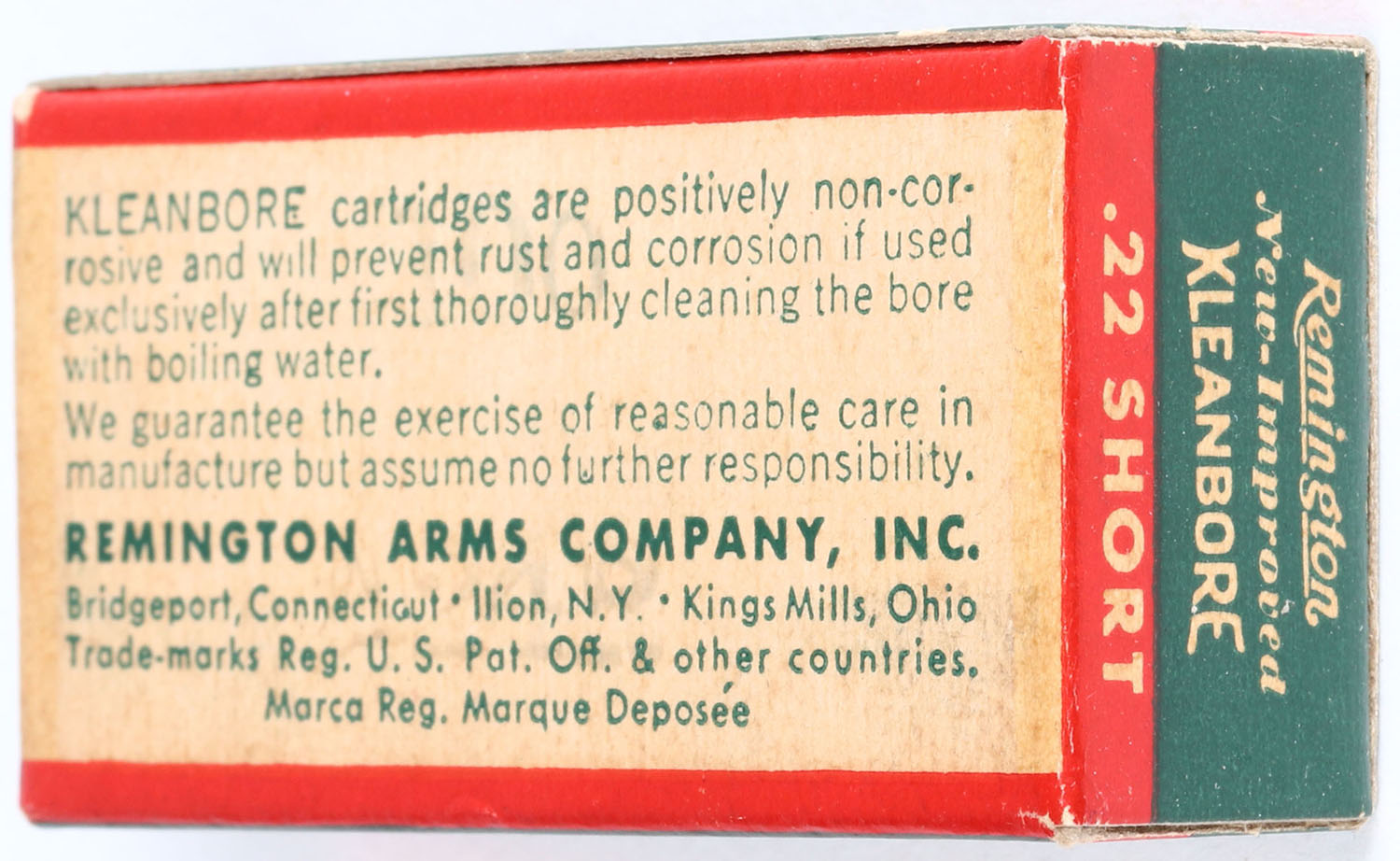 Remington, New and Improved Kleanbore, .22 Short, RHWeb: REM-11 S-1, Full, 1pc. Green white & red box, box is near mint with excellent color, only very minor age soiling, corners are sharp, edges are crisp, end flaps are solid, ammo is excellent. Grade: Excellent ++ - Value: 6 to 30