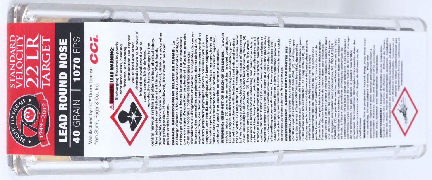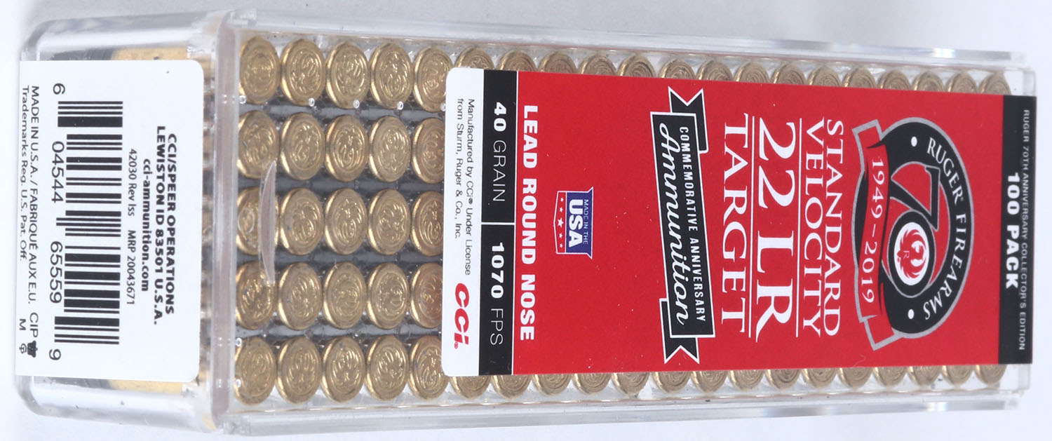 CCi, Ruger Firearms 70 Year Anniversary Commemorative Edition, Standard Velocity, .22 Long Rifle, 40 Grain Lead Round Nose, 1070 FPS, FULL & SEALED, 2pc. Clear plastic tray with red black & white label, box is MINT, label is mint, ammo is mint. Grade: MINT - Value: 10 to 50