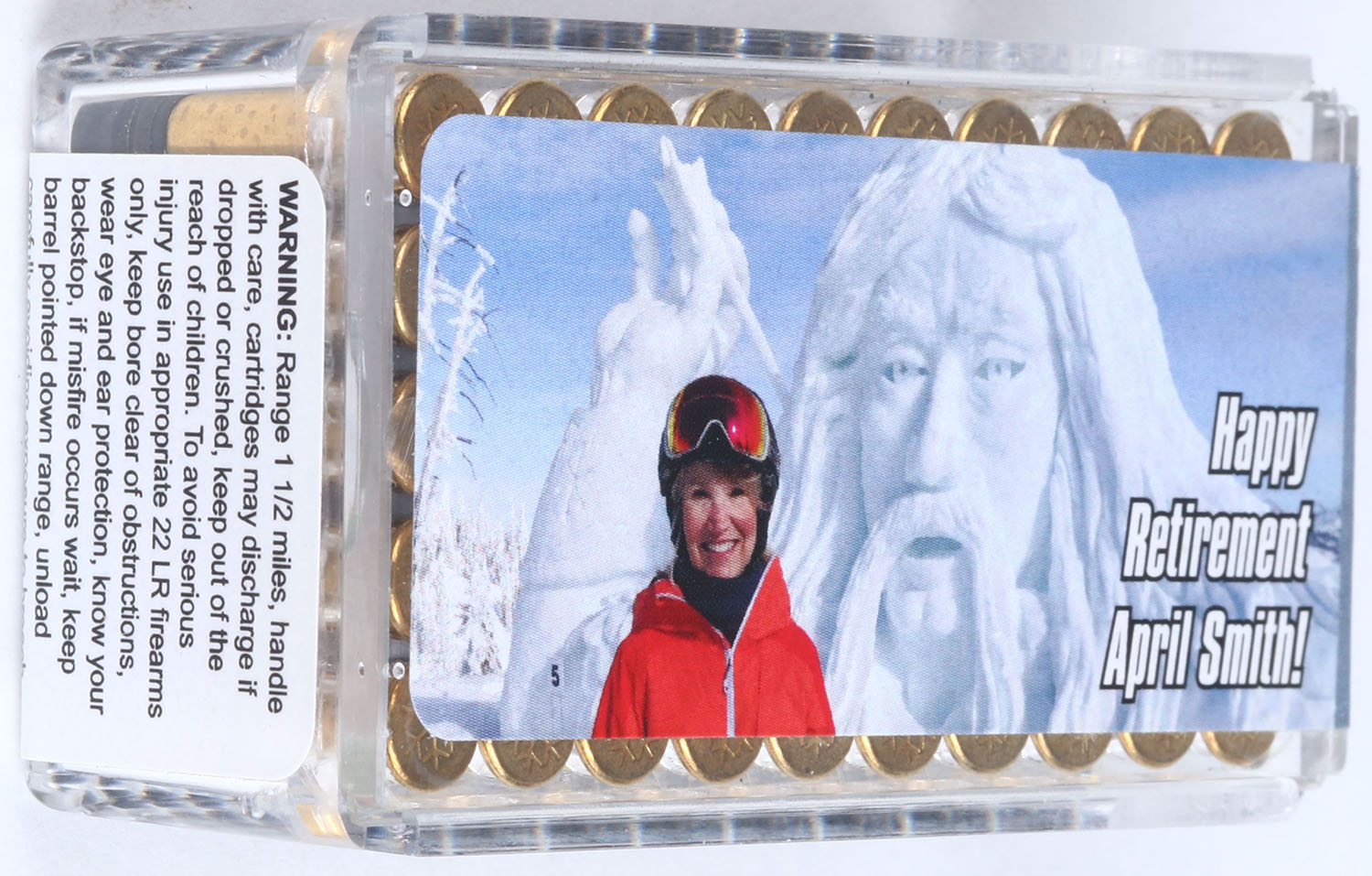 CCi, April Smith Retirement Commemorative box, .22 Long Rifle, Standard Velocity, FULL & SEALED, 2pc. Clear plastic tray with multicolored label that features April in front of a snow sculpture, box has one crack on front and one on back that both appear to be superficial, label is intact with minty color, ammo is mint. Grade: Excellent + - Value: 40 to 120