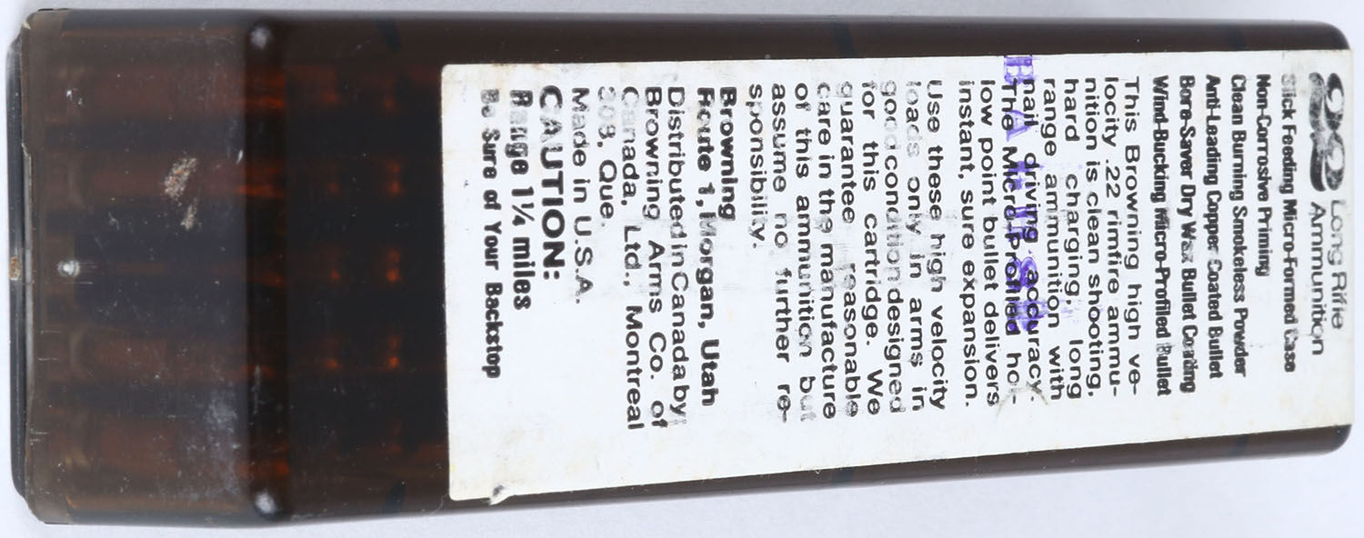 Browning, Nail Drivers, .22 Long Rifle Hollow Point, High Velocity, RHWeb: BROWN-2 LR-2, Full & Sealed, 2pc. Smoke colored plastic box with yellow & black label, box is solid, label has very good color with some color fading & shelf wear, ammo appears mint. Grade: Excellent - Value: 10 to 40