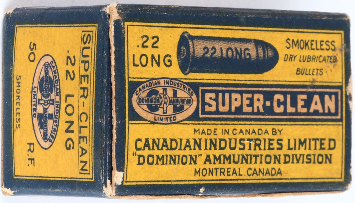 CIL, Super-Clean, .22 Long, Smokeless, Dry Lubricated Bullets, RHWeb: CIL-2 L-2, Full, 1pc. Yellow & blue box, box is solid with very good to excellent color, some age soiling, minor edge & corner wear, top flap is solid, ammo is excellent to minty. Grade: Excellent + - Value: 10 to 40