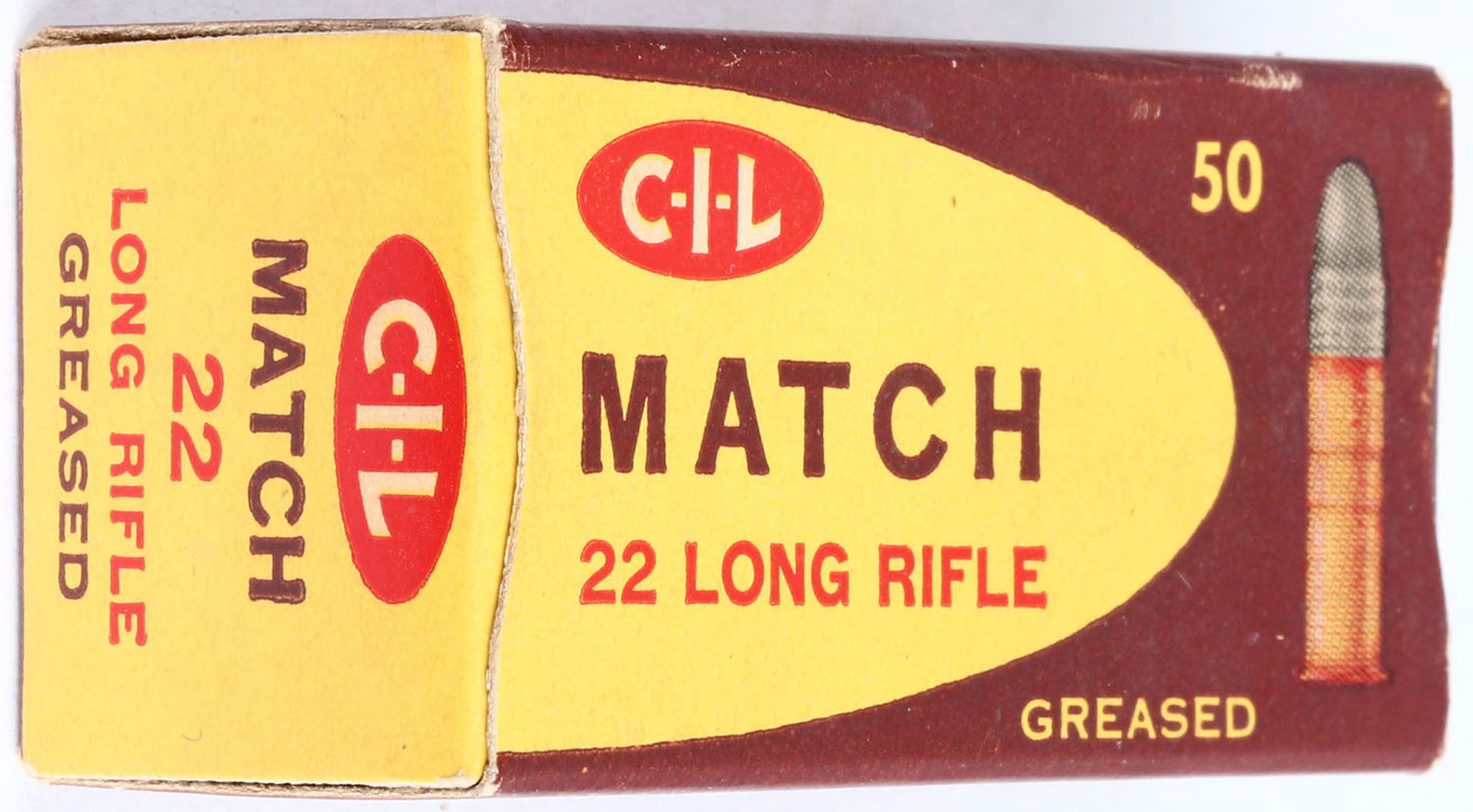 CIL, Match, .22 Long Rifle, Greased, RHWeb: CIL-5 LR-5, Full, 1pc. Brown yellow & red box, box is near mint with excellent to minty color, only very minor shelf wear, corners are sharp, edges are crisp, end flaps are solid, ammo is excellent. Grade: Excellent ++ - Value: 10 to 50