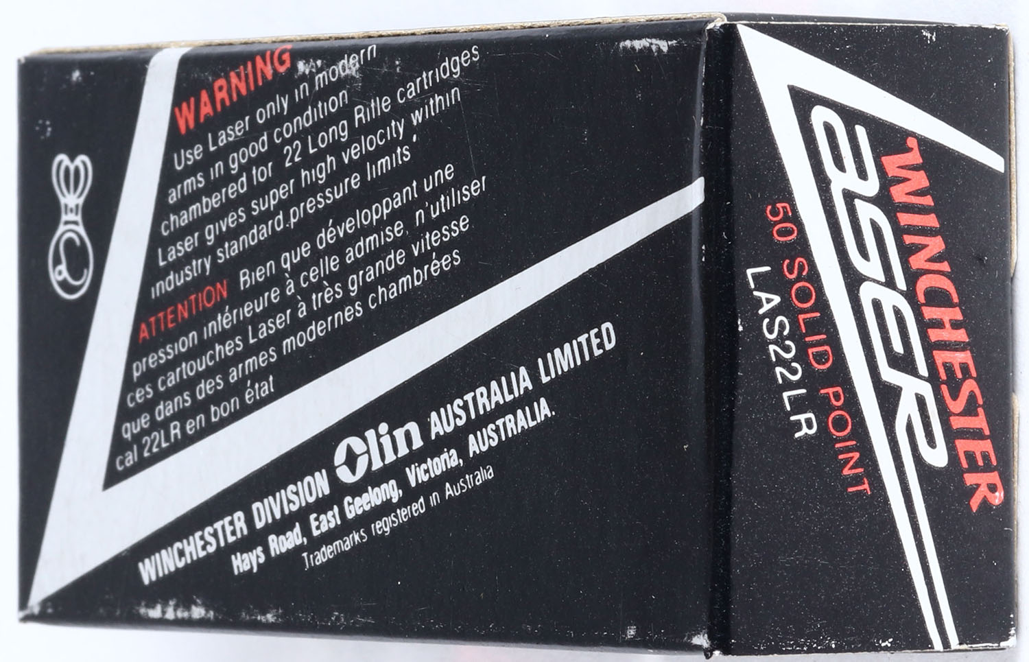 Winchester (Australia), Laser, .22 Long Rifle, Extra High Velocity, Solid Point, RHWeb: (Australia) LASER-1 LR-3a, Full, 1pc. Black silver & red box, box is solid with minty color, very minor shelf wear, one very minor corner ding on top front, corners are otherwise sharp, edges are crisp, end flaps are solid, ammo is minty. Grade: Excellent ++ - Value: 20 to 60