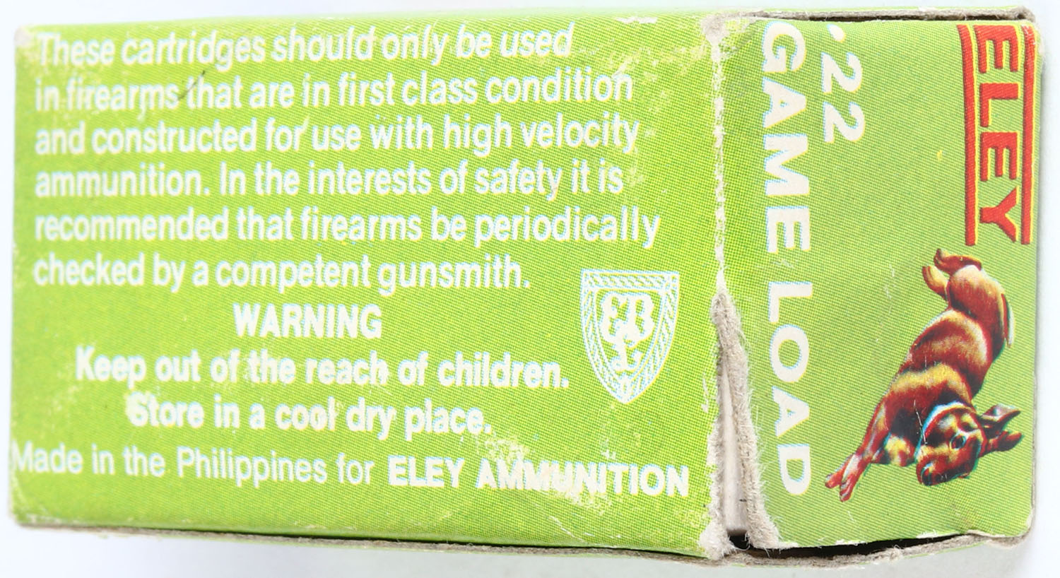Eley (Philippines), 22 Game Load, .22 Long Rifle, High Velocity, RHWeb: (Philippines) ELEY-1 LR-5, Full, 1pc. Green red & white box, box is solid with excellent color, scuff on top, some shelf & corner wear, edges are crisp, end flaps are solid, ammo is excellent. Grade: Excellent + - Value: 6 to 30