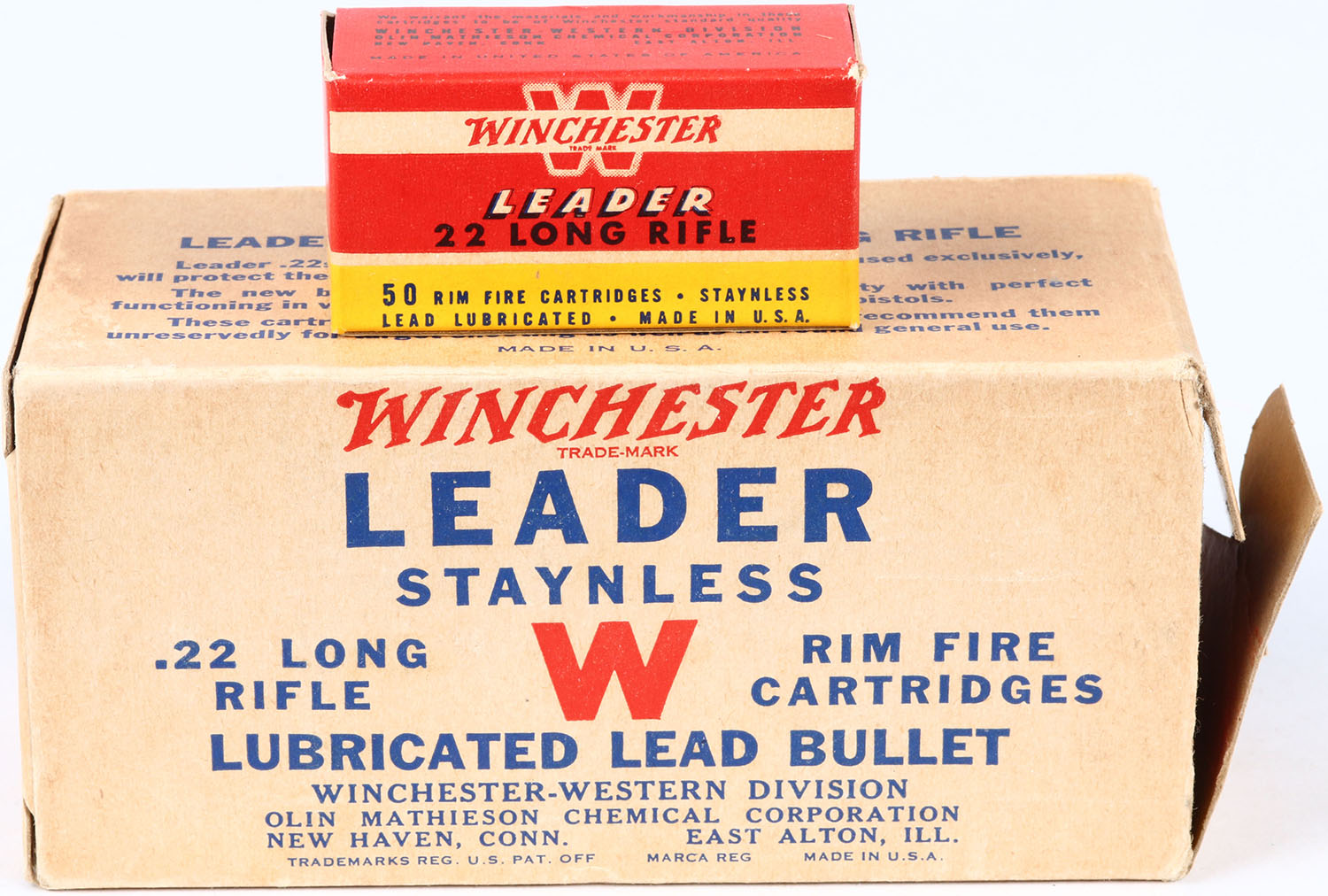 Winchester, Leader, .22 Long Rifle, Staynless, Full, 500rds. 1pc. Buff brick with blue & red printing, brick is missing right end flap, has excellent color, minor age soiling, very minor edge & corner wear, inside boxes are minty. Grade: Very Good ++ - Value: 50 to 150