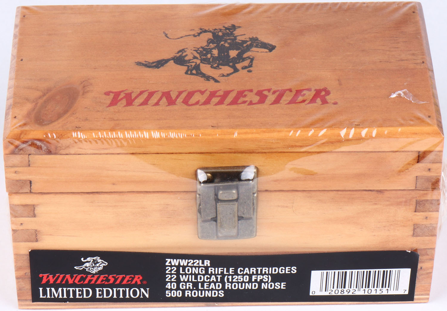 Winchester, Limited Edition Latching Wood Box, 22 Wildcat, .22 Long Rifle, High Velocity, FULL & SEALED 500rds. brick, wood box is MINT, labels are mint. Grade: MINT - Value: 40 to 80