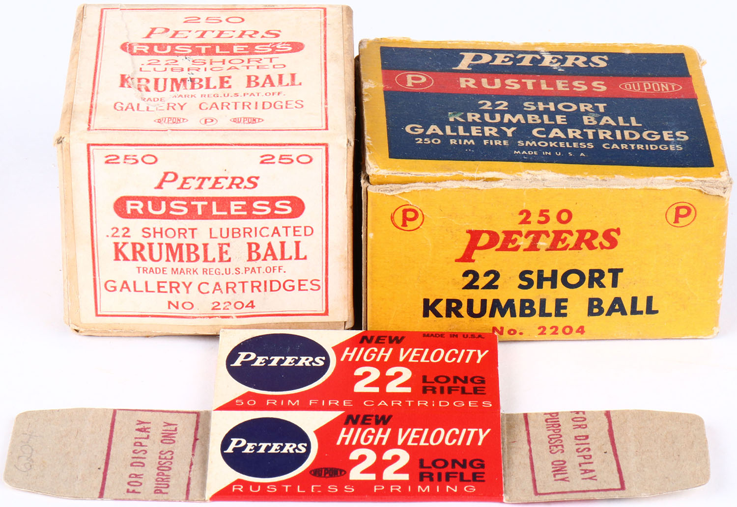 Peters, Krumble Ball, .22 Short, lot of (2) Empty bulk boxes & (1) empty 22 box, boxes are solid with excellent color, some age soiling, edge & corner wear, peters box is stamped ''For display purposes only'' on inside flaps. Grade: Excellent - Value: 10 to 100