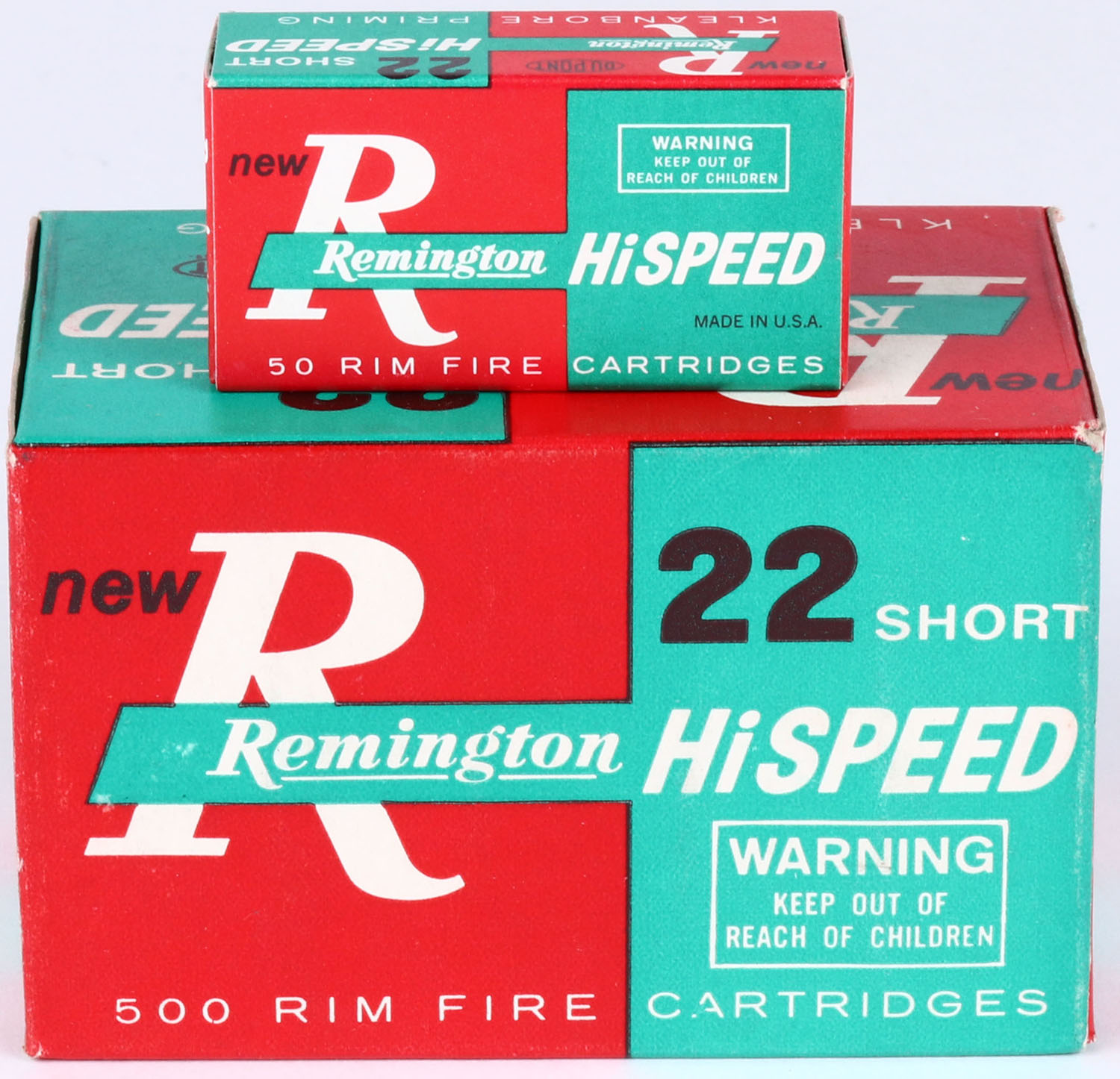 Remington, HiSpeed, .22 Short, Full, 500rds. 1pc. Red Green & white brick, brick is near mint with minty color, only very minor shelf wear on bottom, corners are sharp, edges are crisp, end flaps are solid, inside boxes are MINT. Grade: Excellent ++ - Value: 80 to 160