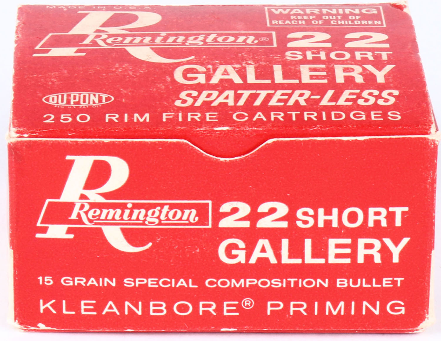 Remington, Gallery Spatter-Less, .22 Short, Full, 250rds. 1pc. White & red bulk box, box is solid with excellent color, minor age soiling & shelf wear, very minor corner wear, edges are crisp, top flap is solid, ammo is excellent to minty. Grade: Excellent + - Value: 30 to 60