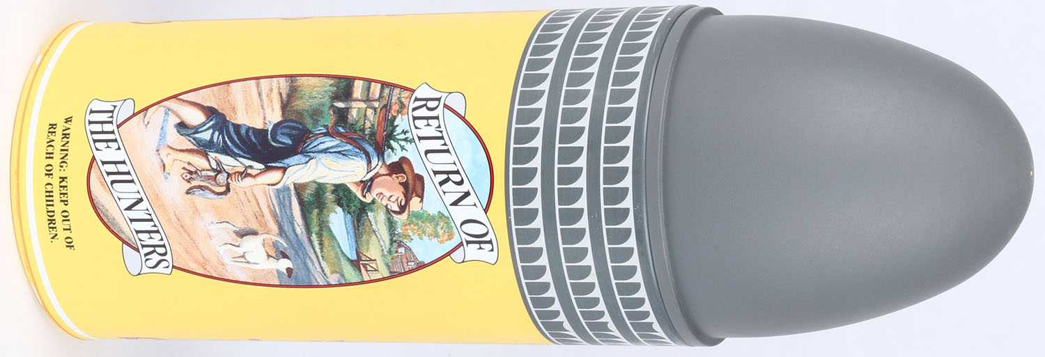 Remington, ''Return of The Hunters'', Full, 350 Long Rifle rounds (golden bullet?) in a tin the shape of a .22 bullet, ammo is sealed in plastic bag inside, tin is solid with minty color, no rust. Grade: MINT - Value: 30 to 90