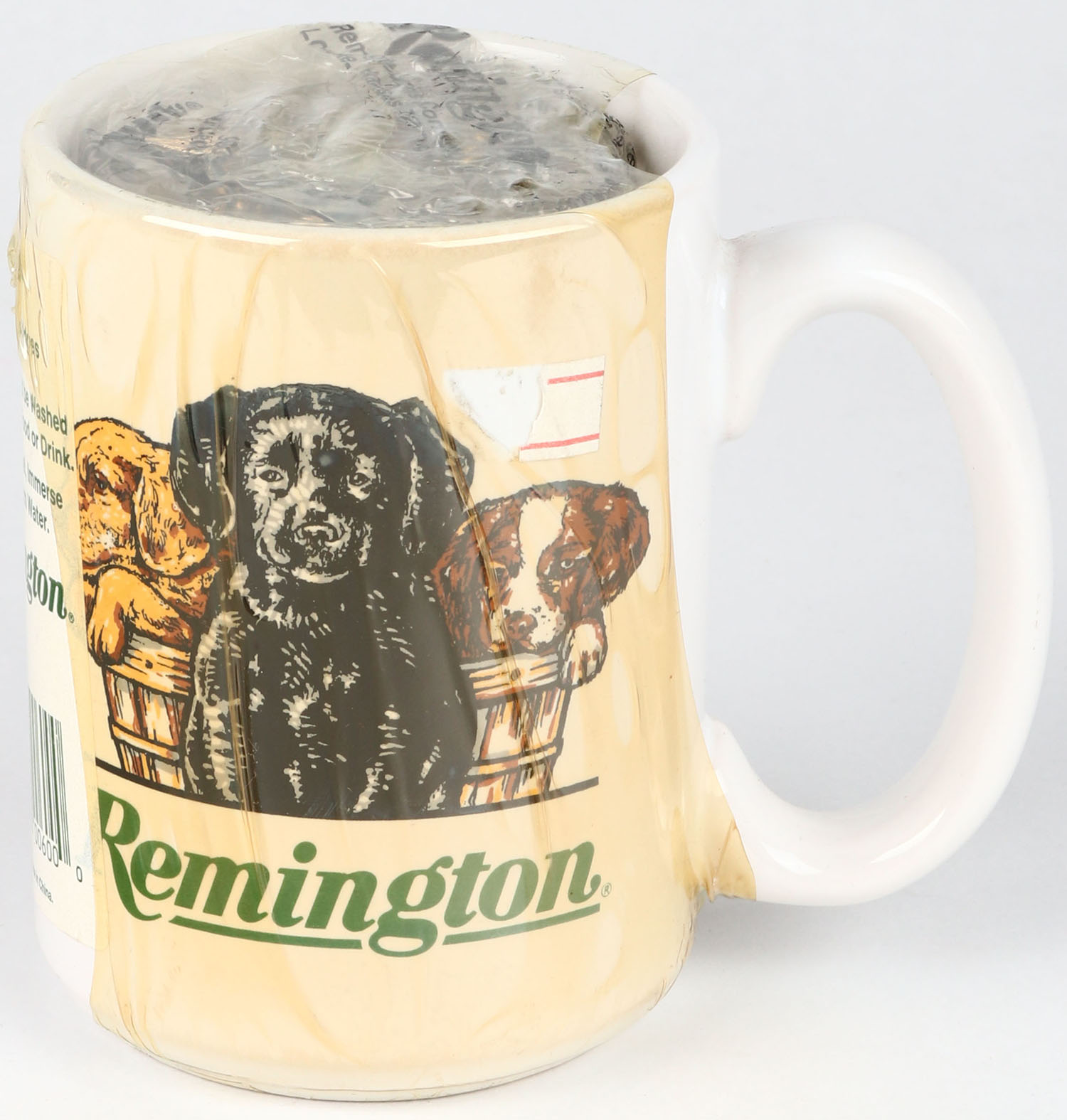 Remington, Hunting Dog Coffee Mug, .22 Long Rifle, FULL & SEALED, 350rds. White mug featuring 3 hunting dog puppies with a send off to hunting dogs on the back, mug is near mint with only some yellowing to the sealing plastic on the front side, ammo appears mint. Grade: Excellent ++ - Value: 10 to 40