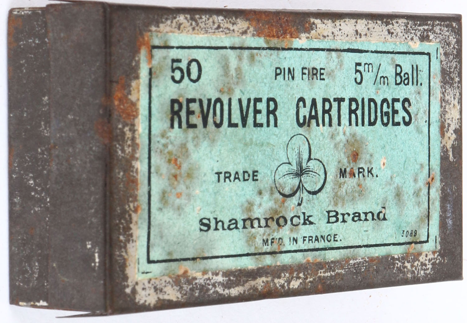 Shamrock Brand, Pin Fire, 5mm Ball, Revolver Cartridges, Partial 33rds. 2pc. Metal tin box with green top label, label has very good color, minor age soiling, rust showing through label, tin is solid with good color, some rust throughout, ammo is very good to excellent. Grade: Very Good + - Value: 30 to 120