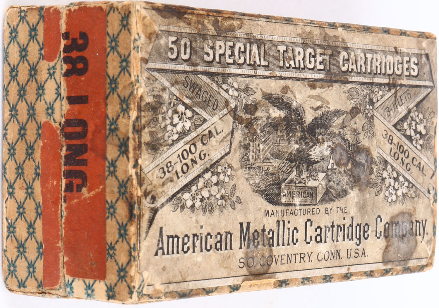 American Metallic, Special Target Cartridges, .38 Long, Full, 2pc. Blue & white patterned box with gray/white top label & orange side sealing band, box is solid with good to very good color, age soiling, staining to top, some shelf wear, minor edge & corner wear, vertical seam splits to bottom of right end, side sealing band is 75% intact, ammo is very good. Grade: Very Good + - Value: 50 to 200