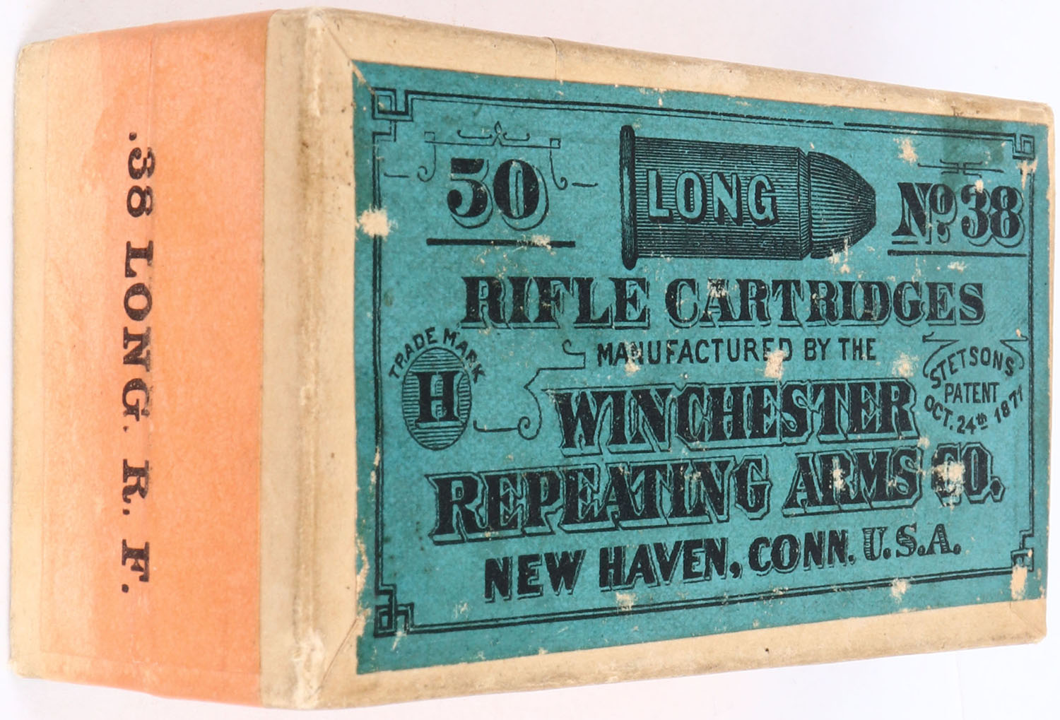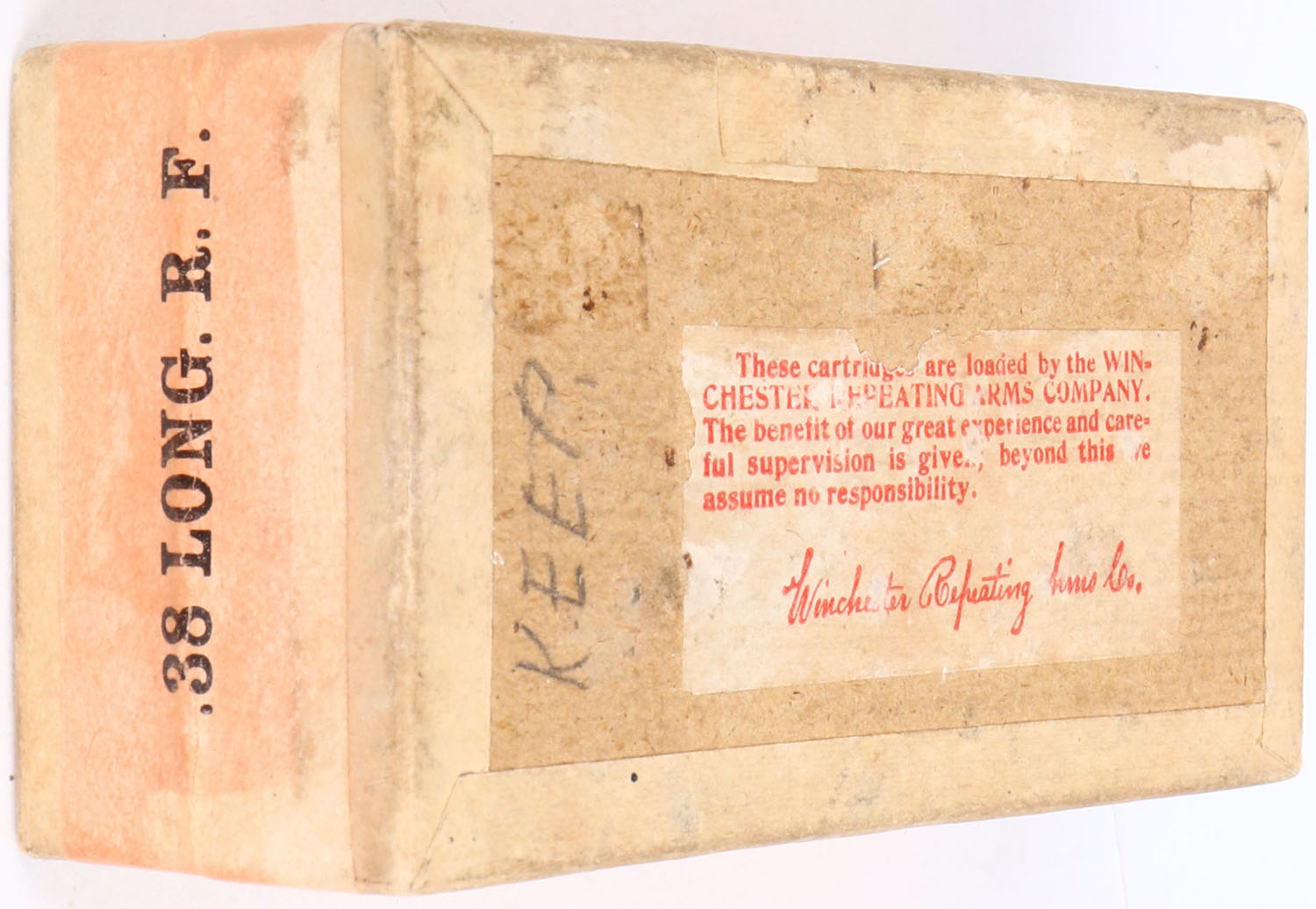 Winchester, .38 Long Rim Fire, Oct. 24 Patent, FULL & SEALED, 2pc. Buff box with blue top & orange side sealing labels, box is solid with excellent color, very minor age soiling, minor shelf wear, corners are mostly sharp, edges are crisp, bottom has been written on, labels are intact. Grade: Excellent ++ - Value: 150 to 300