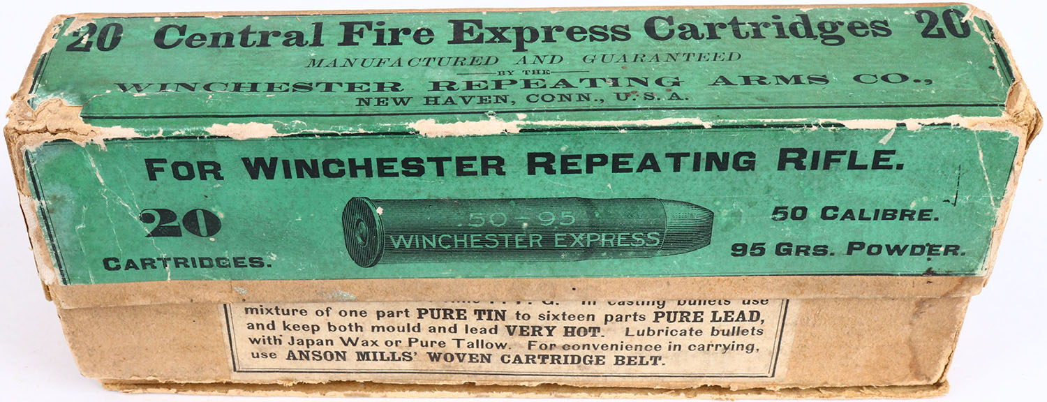 Winchester, .50-95 Winchester Express, Partial 16rds., 2pc. Buff box with green label, box is solid with excellent color, very minor age soiling, edge & corner wear, partial seam split on bottom left end, ammo is excellent. Grade: Excellent - Value: 100 to 500