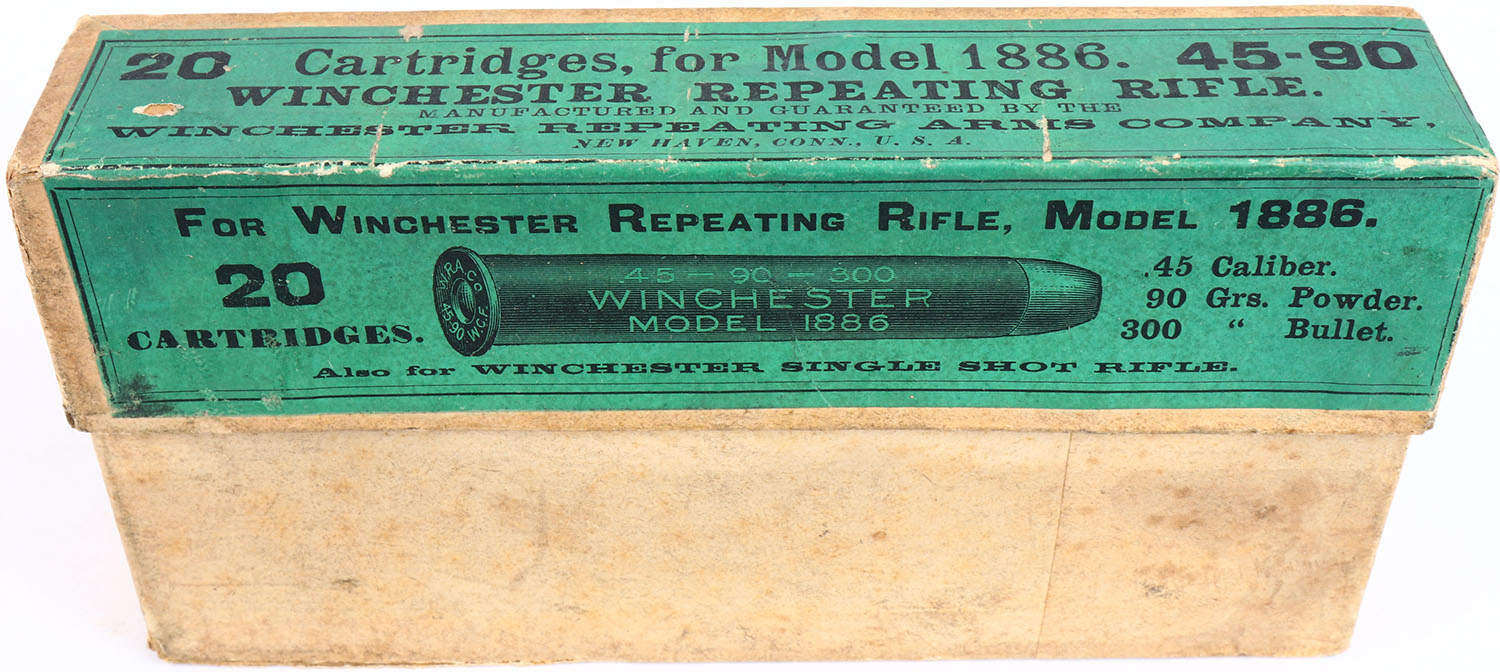 Winchester, .45-90-300, Model 1886, Full, 2pc. Buff box with green label, box is solid with excellent color, some age soiling, minor edge & corner wear, very minor shelf wear, labels are intact, ammo is excellent. Grade: Excellent + - Value: 200 to 400