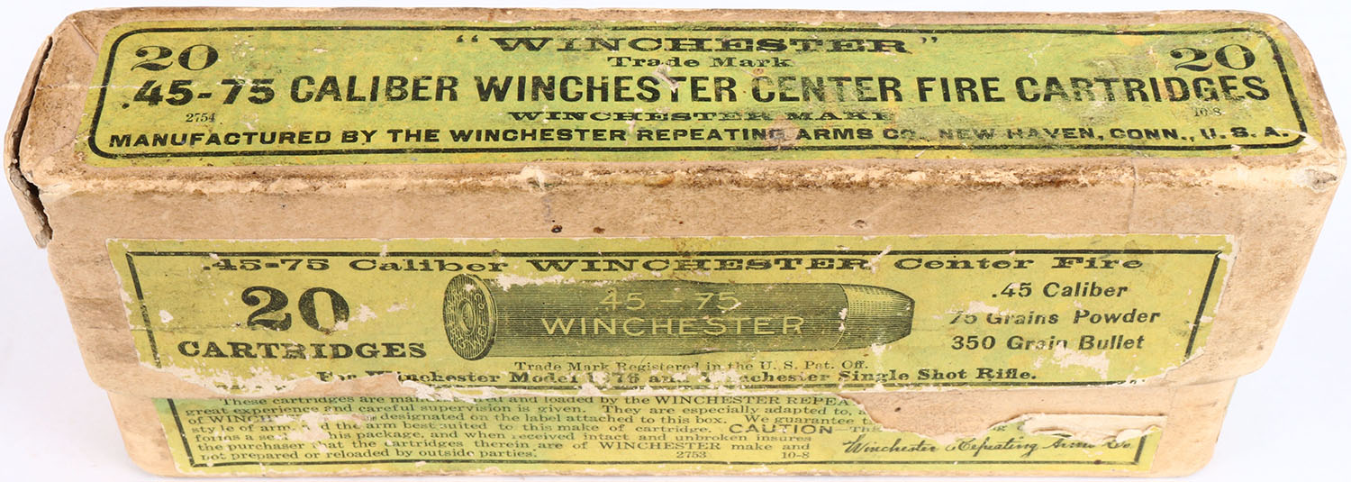 Winchester, .45-75, 350 Grain Bullet, Partial 11rds. Mixed Ammo, 2pc. Buff box with green labels, box is solid with very good color, some age soiling, shelf wear, some edge & corner wear, left end of lid is torn and missing a piece, label is 95% intact, ammo is very good. Grade: Very Good + - Value: 10 to 100