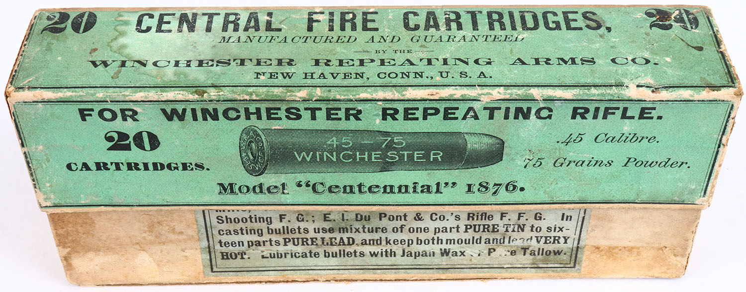 Winchester, .45-75, Model ''Centennial'' 1876, Full, 2pc. Buff box with green labels, box is solid with excellent color, some age soiling, seam split to bottom front edge, staining to top, some edge & corner wear, minor shelf wear, labels are intact, ammo is excellent. (1525) Grade: Very Good ++ - Value: 150 to 300