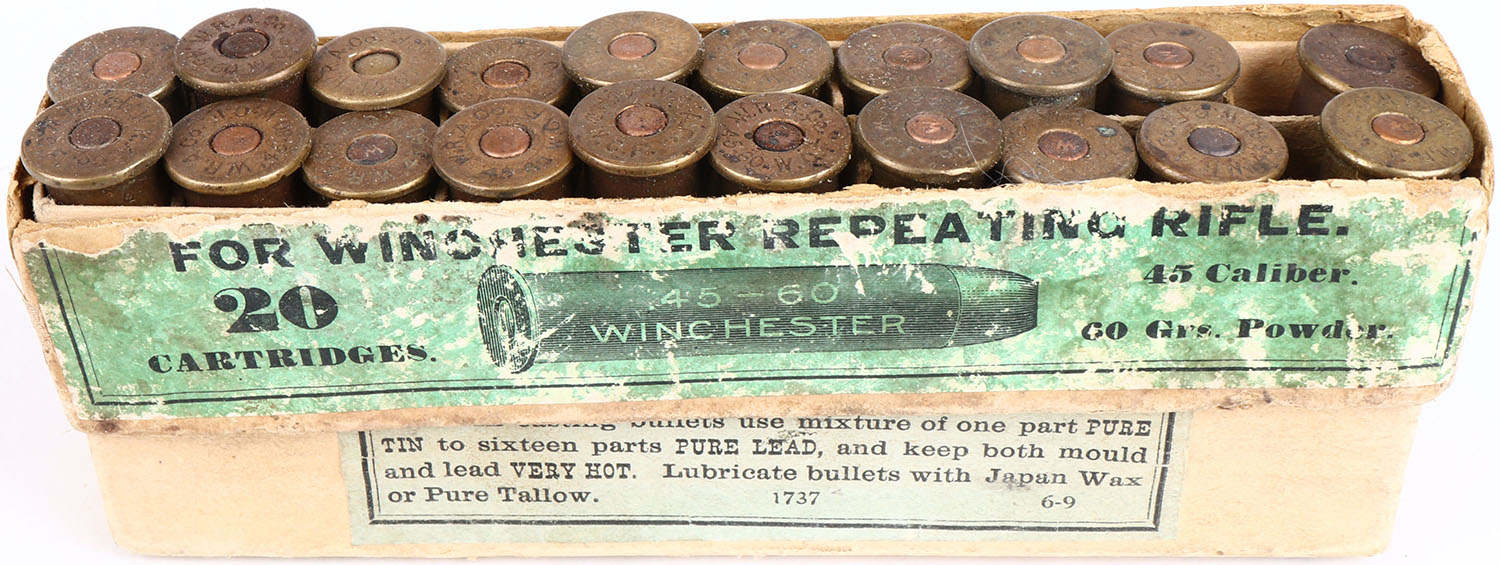 Winchester, .45-60, Full, 2pc. Buff box with green label, box is missing the top of lid, age soiling, shelf wear, ammo is very good. Grade: Good + - Value: 30 to 90