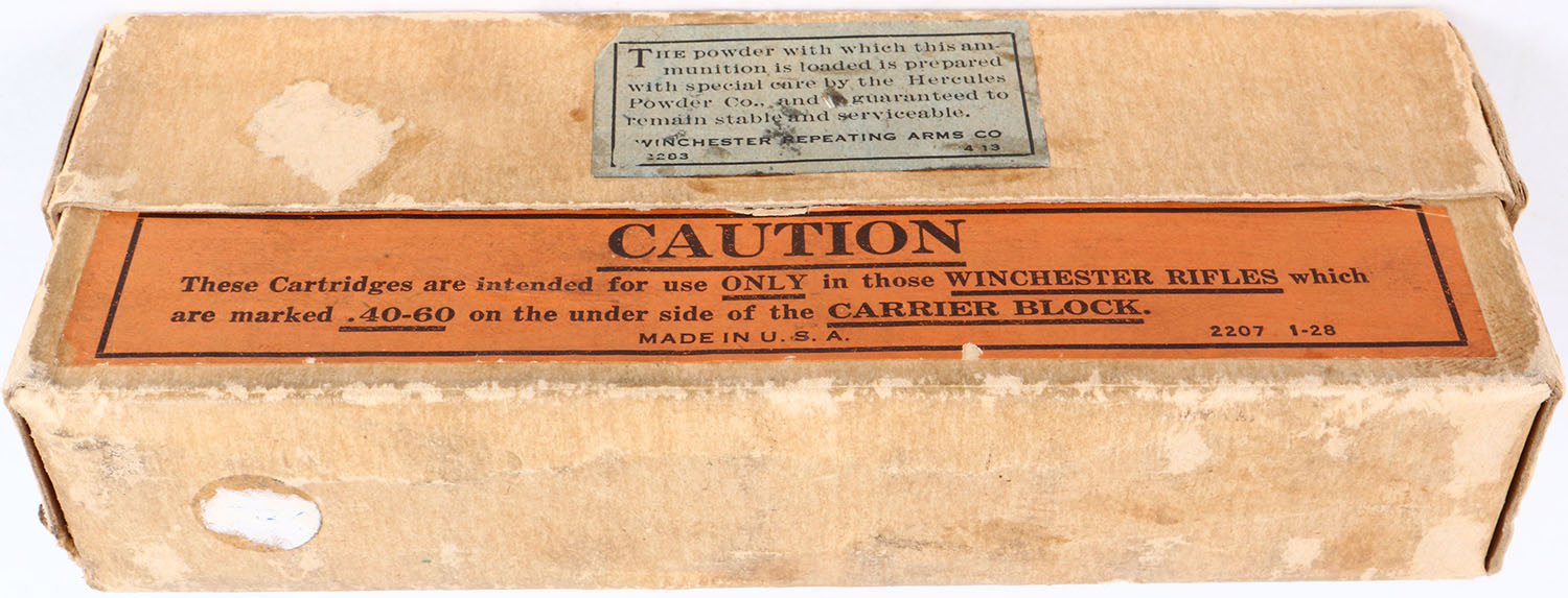 Winchester, .40-60-210, Black Powder, Model 76 and Single Shot Rifles, Full, 2pc. Buff box with green labels, box is solid with excellent color, some age soiling, minor edge & corner wear, some shelf wear, labels are intact, ammo is excellent. Grade: Excellent + - Value: 50 to 150