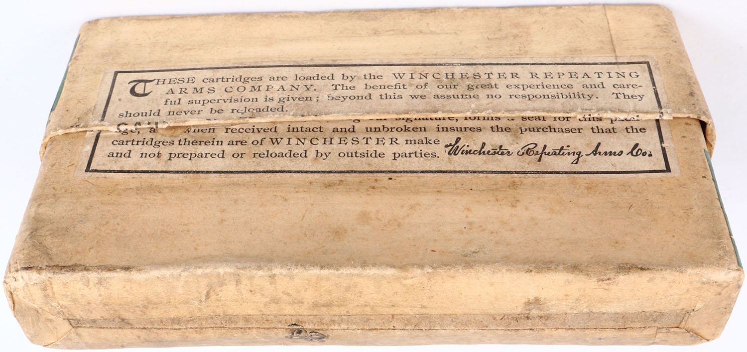 Winchester, .303 British, Smokeless Powder, Model 1895 and Lee Metford Rifles, Full, 2pc. Buff box with green labels, box is solid with very good color, age soiling, very minor shelf & edge wear, minor corner wear, labels are intact, most ammo has cracked necks but is otherwise excellent. Grade: Excellent - Value: 50 to 200
