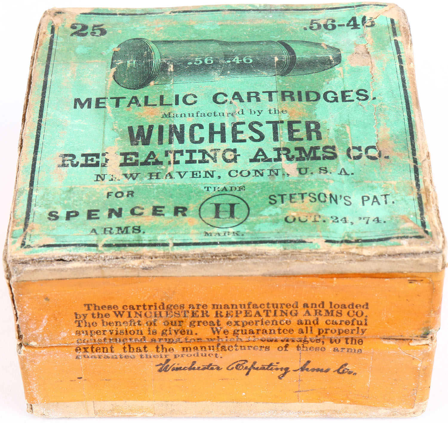 RARE! Winchester, Metallic Cartridges, 56-46, For Spencer Arms, Full, 2pc. Buff Box with green top & orange side sealing labels, box is solid with very good color, some age soiling, shelf wear, some edge & corner wear, bottom has tape on it, labels are intact, ammo is fair to good. Grade: Very Good ++ - Value: 800 to 2400