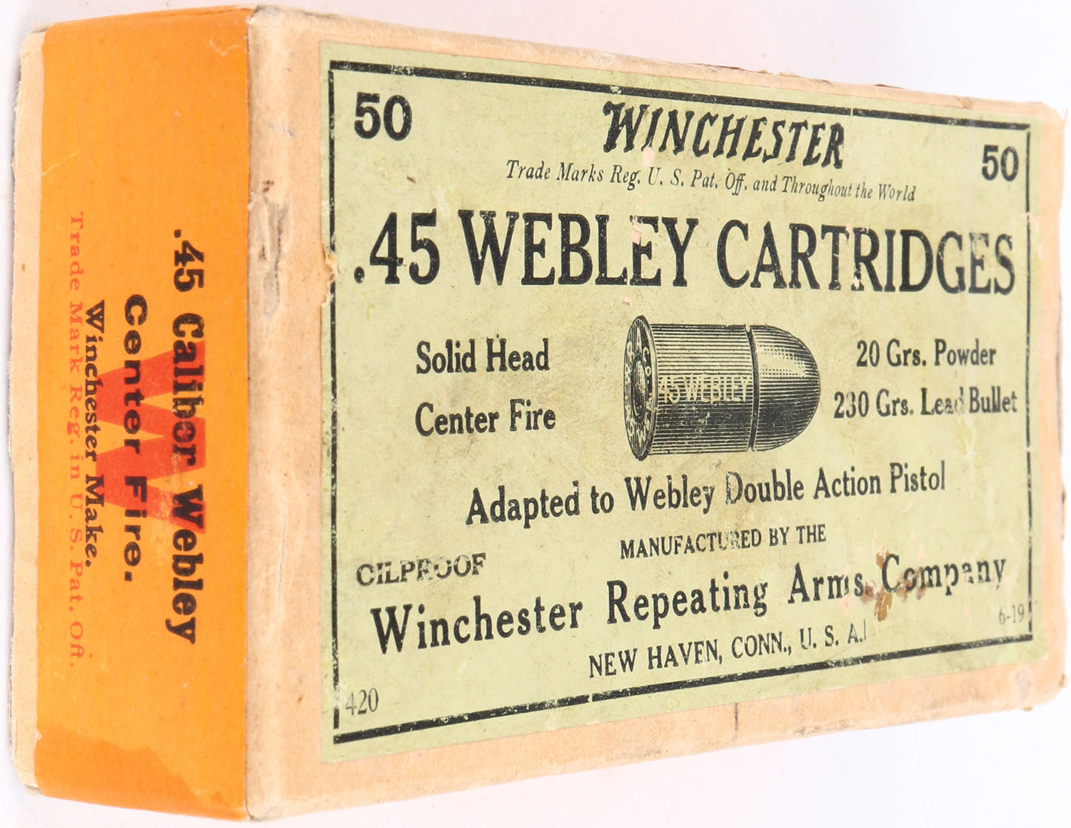 Winchester, .45 Webley, Webley Double Action Pistol, 20 Grs. Powder, 230 Grs. Lead Bullet, FULL & SEALED, 2pc. Buff box with green top & orange side sealing labels, box is solid with excellent color, very minor shelf wear & staining to the front, very minor edge & corner wear, partial seam splits to both top and bottom edge of right end, labels are intact. Grade: Excellent + - Value: 150 to 300