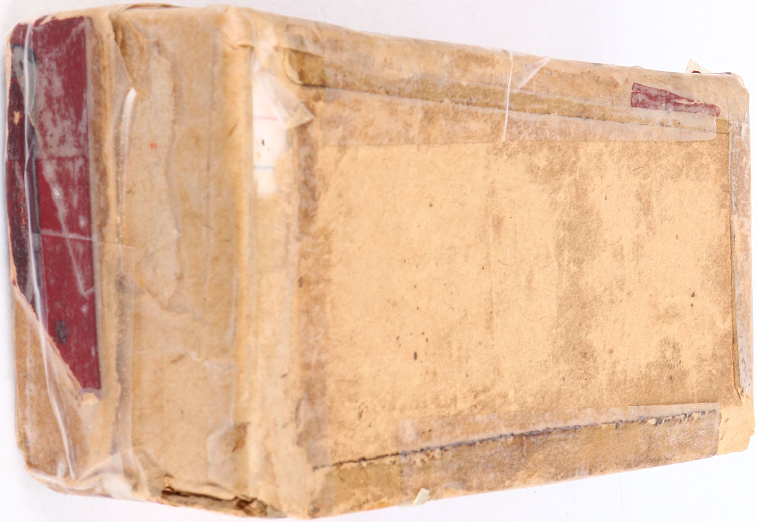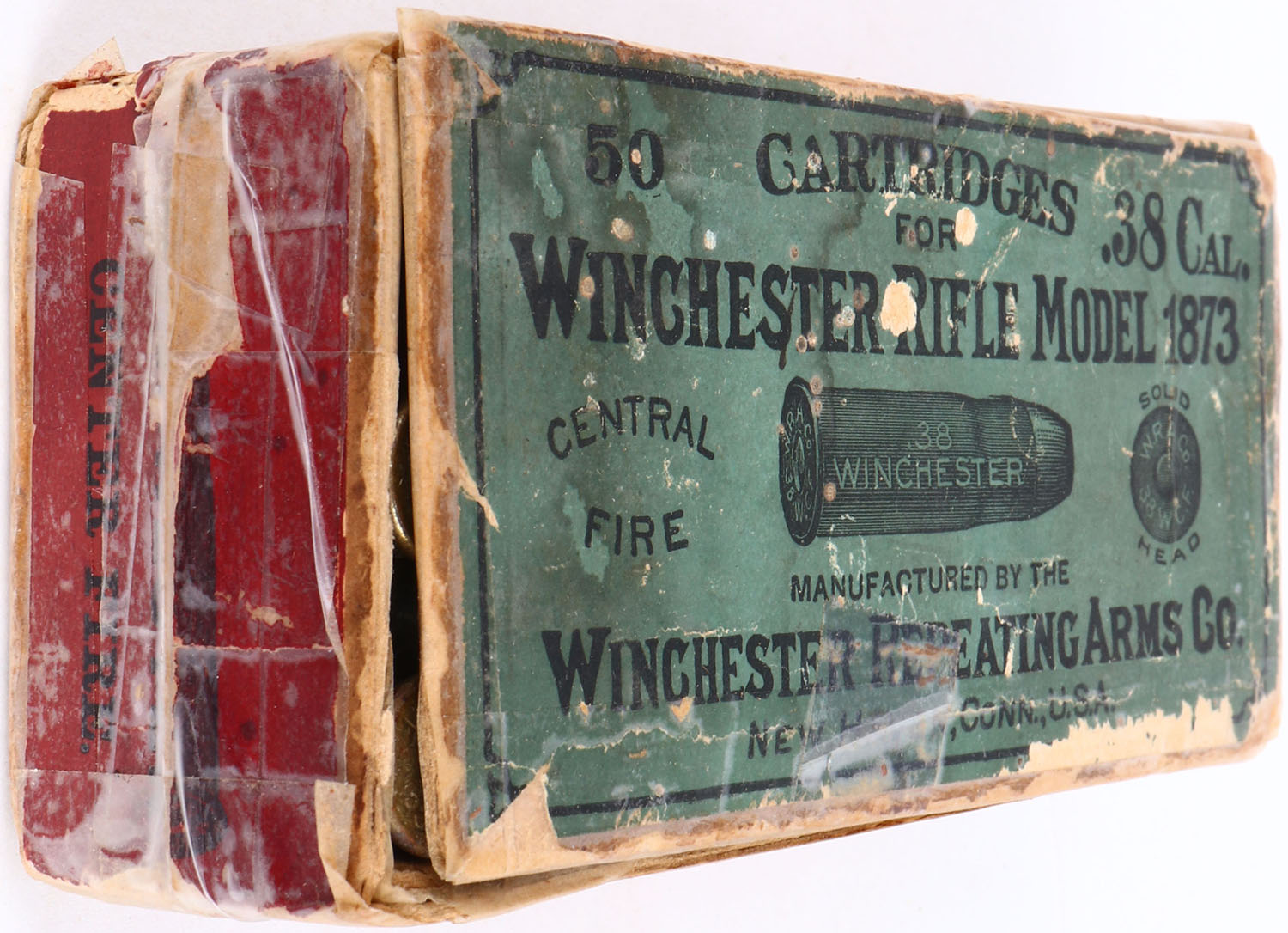 Winchester, .38 Cal. Model 1873, Solid Head, Full & correct, 2pc. Buff box with green top & red side sealing labels, top seams torn, tape on sides and ends, box has very good color, age soiling, shelf wear, edge & corner wear, some staining to top, labels are 95% intact, ammo is correct &excellent. Grade: Good ++ - Value: 40 to 200