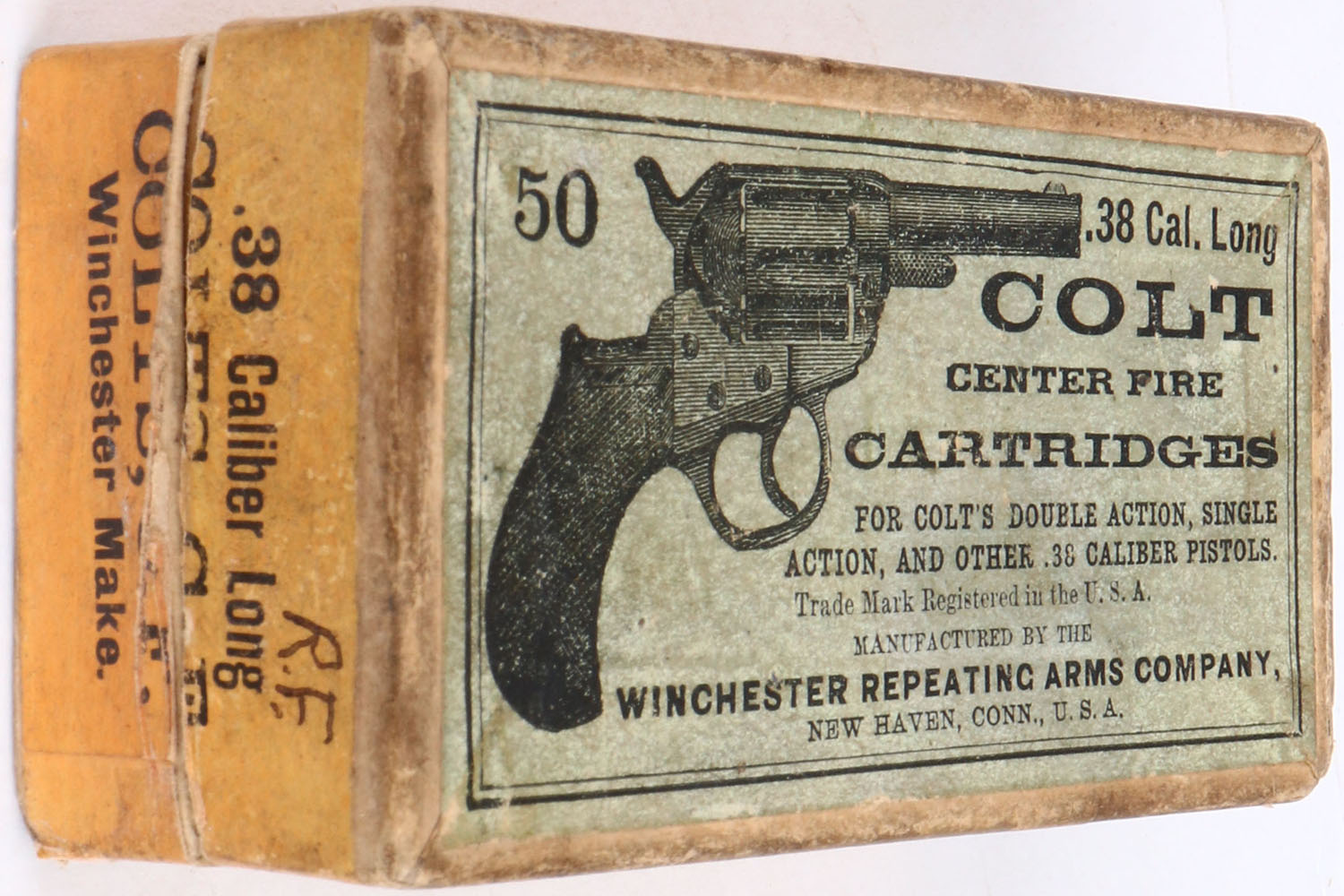Winchester, .38 Long Colt, Colt's Double Action, Single Action, And Other .38 Caliber Pistols, Full, 2pc. Buff box with green top & orange side sealing labels, box is solid with very good color, some age soiling, vertical seam splits to both corners on right end of lid, minor edge & corner wear, left end has been written on, labels are intact, ammo is good. Grade: Excellent - Value: 50 to 150