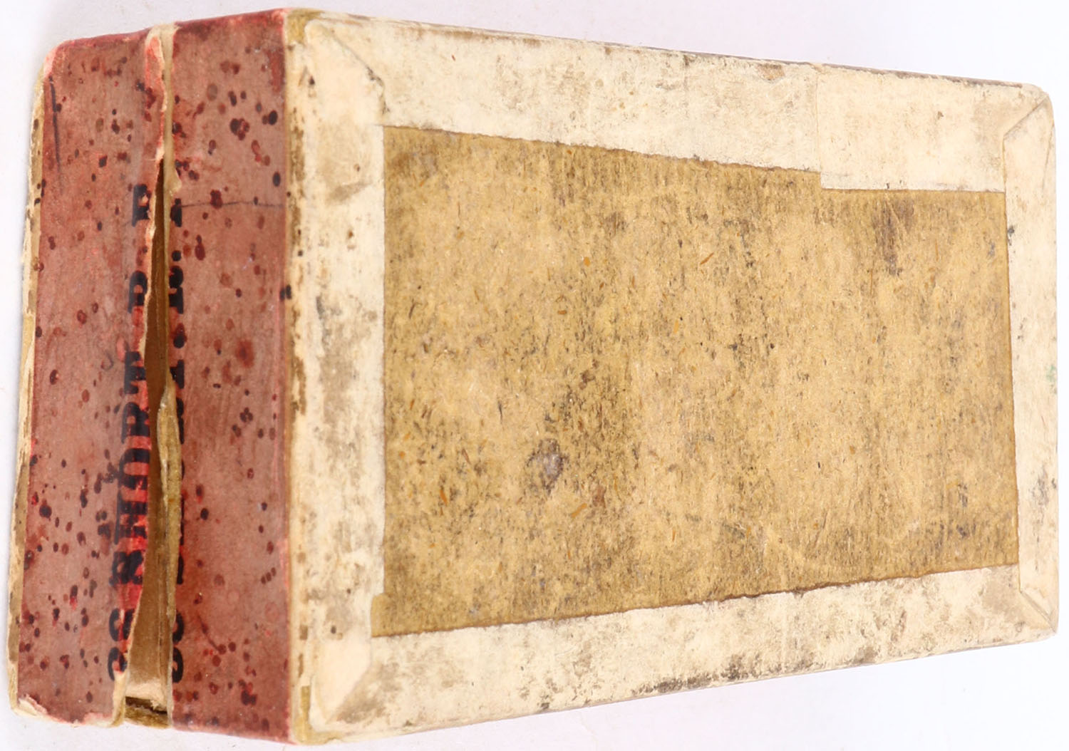 Winchester, .38 Short Rim Fire, Full, 2pc. Buff box with green top & red side sealing labels, box is solid with good to very good color, age soiling some shelf wear, some edge & corner wear, partial seam split to right edge of lid, labels are intact, ammo is excellent. Grade: Very Good ++ - Value: 50 to 150