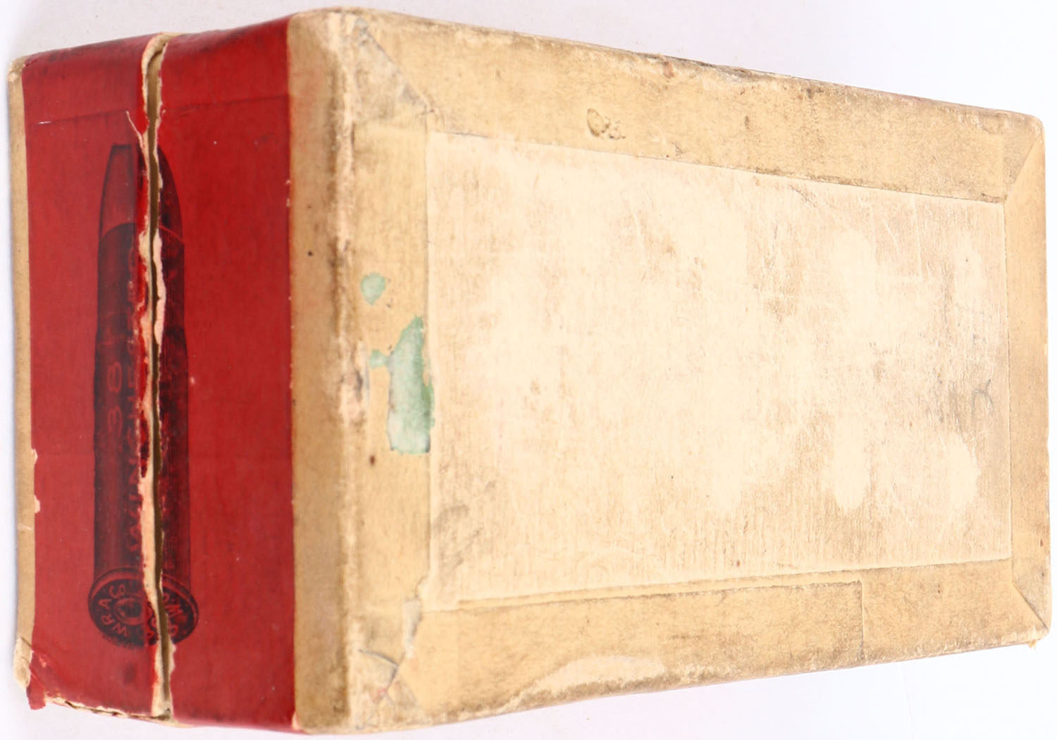 Winchester, .38 Cal., Model 1873, Solid Head, Full, 2pc. Buff box with green top & red side sealing labels, box is solid with very good color, some age soiling & color fading, some shelf & corner wear, edges are mostly crisp, left end has been written on, labels are intact, ammo is very good to excellent. Grade: Excellent - Value: 150 to 300