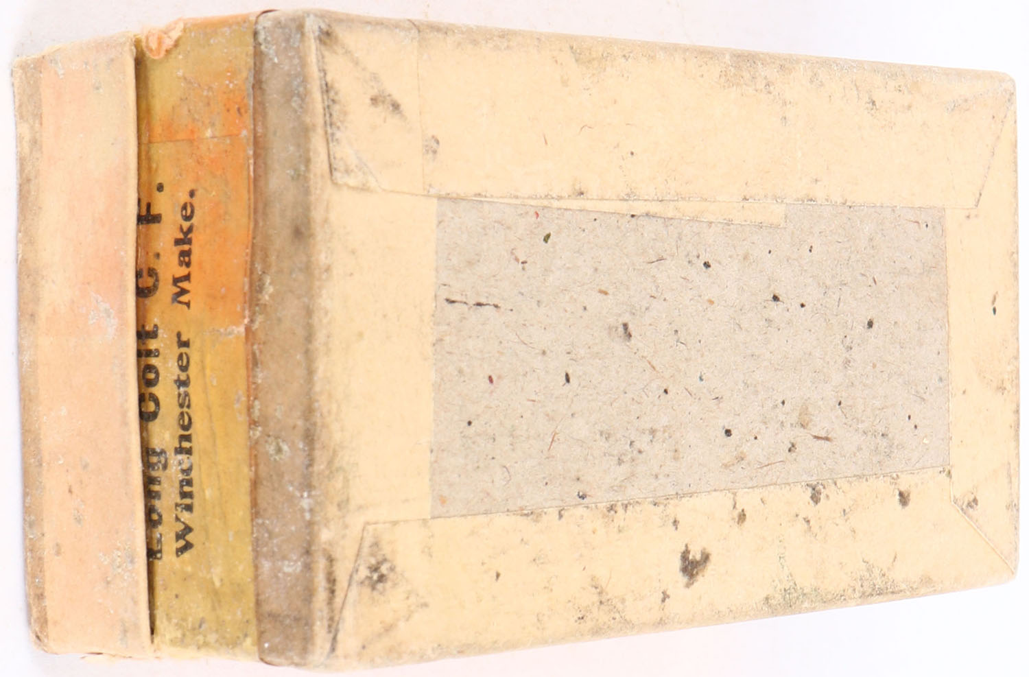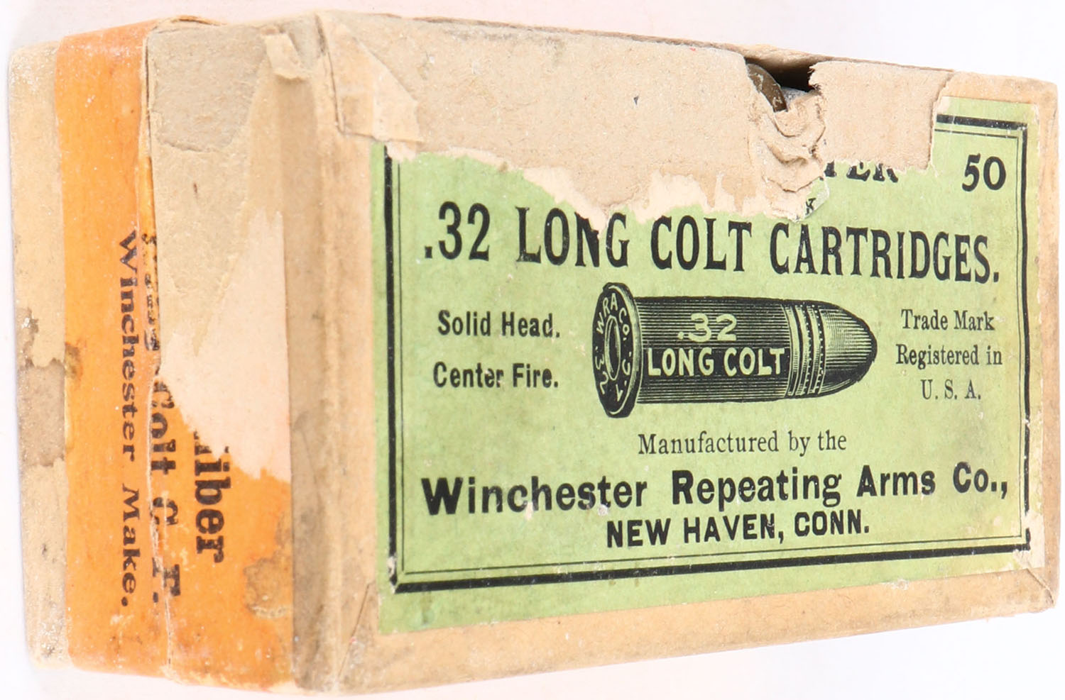Winchester, .32 Long Colt, Solid Head, Full, 2pc. Buff box with green top & orange side sealing labels, box is mostly solid with excellent color, very minor age soiling, staining to bottom, missing back side of lid, corners are mostly sharp, edges are mostly crisp, side sealing label is sealed on front side, labels are 80% intact, ammo is good. Grade: Very Good + - Value: 30 to 90