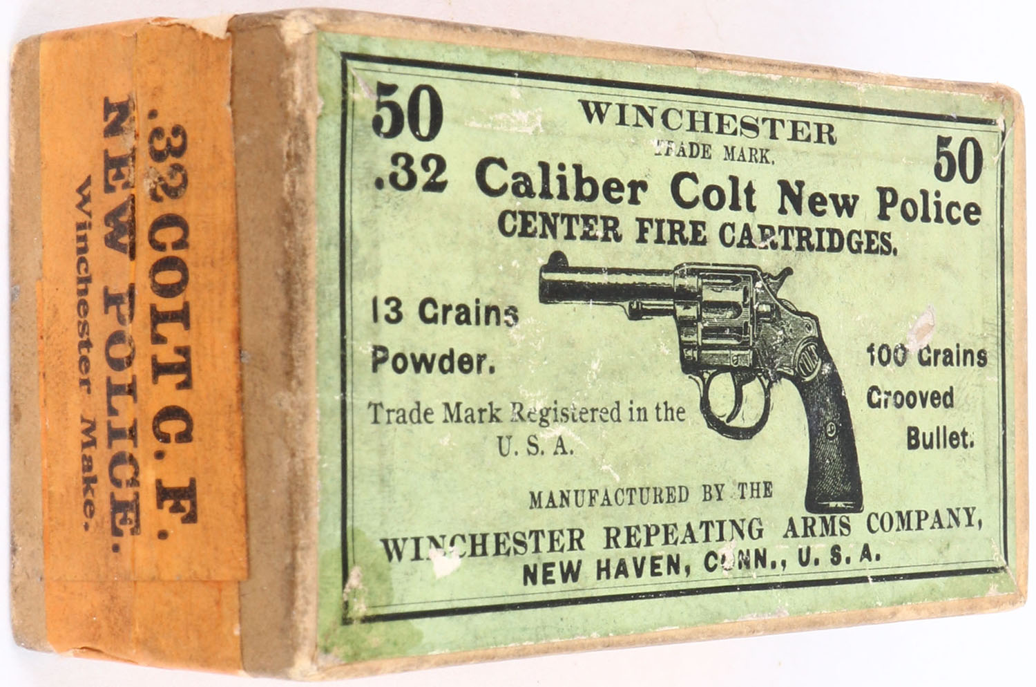 Winchester, .32 Colt New Police, 13 Grains Powder, 100 Grains Grooved Bullet, FULL & SEALED, 2pc. Buff box with green top & orange side sealing labels, box is solid with excellent color, minor age soiling & shelf wear, edges are crisp, corners are sharp, labels are intact. Grade: Excellent ++ - Value: 100 to 300