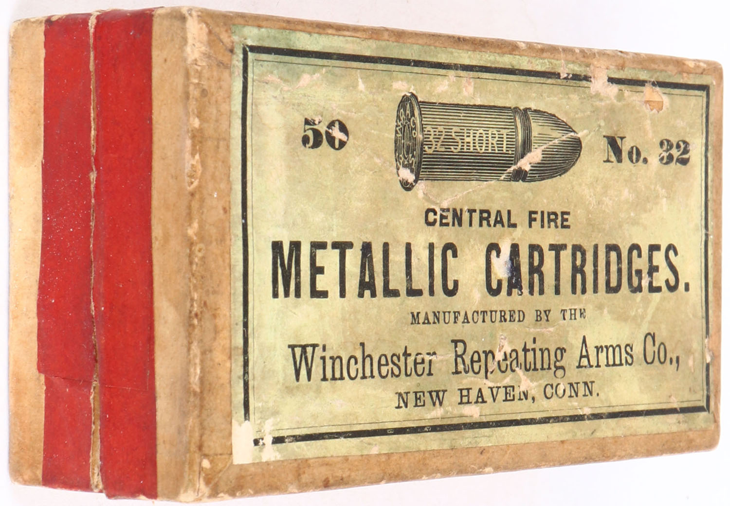 Winchester, Metallic Cartridges, .32 Short Center Fire, Full, 2pc. Buff box with green top & red side sealing labels, box is solid with very good color, some age soiling & color fading to top, very minor corner wear, edges are mostly crisp, labels are intact, ammo is very good to excellent. Grade: Excellent + - Value: 50 to 150