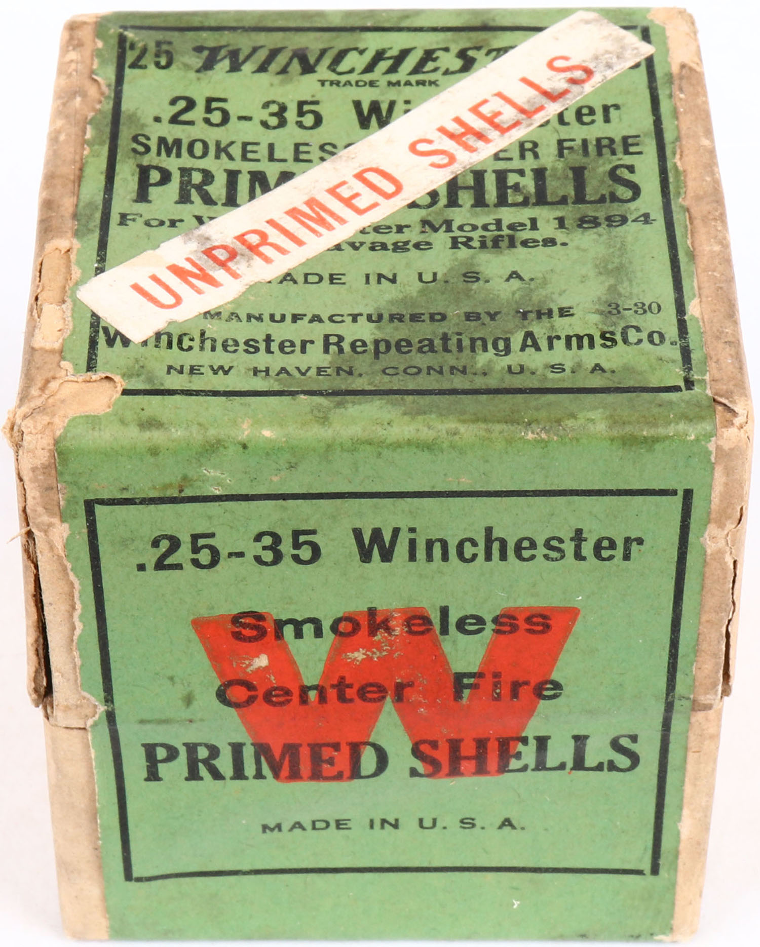 Winchester, .25-35 Unprimed Shells, Smokeless, FULL & SEALED, 2pc. Buff box with green label, box has 3 small seam splits to top label, label has age soiling but is still solid, some age soiling. Grade: Very Good ++ - Value: 40 to 100