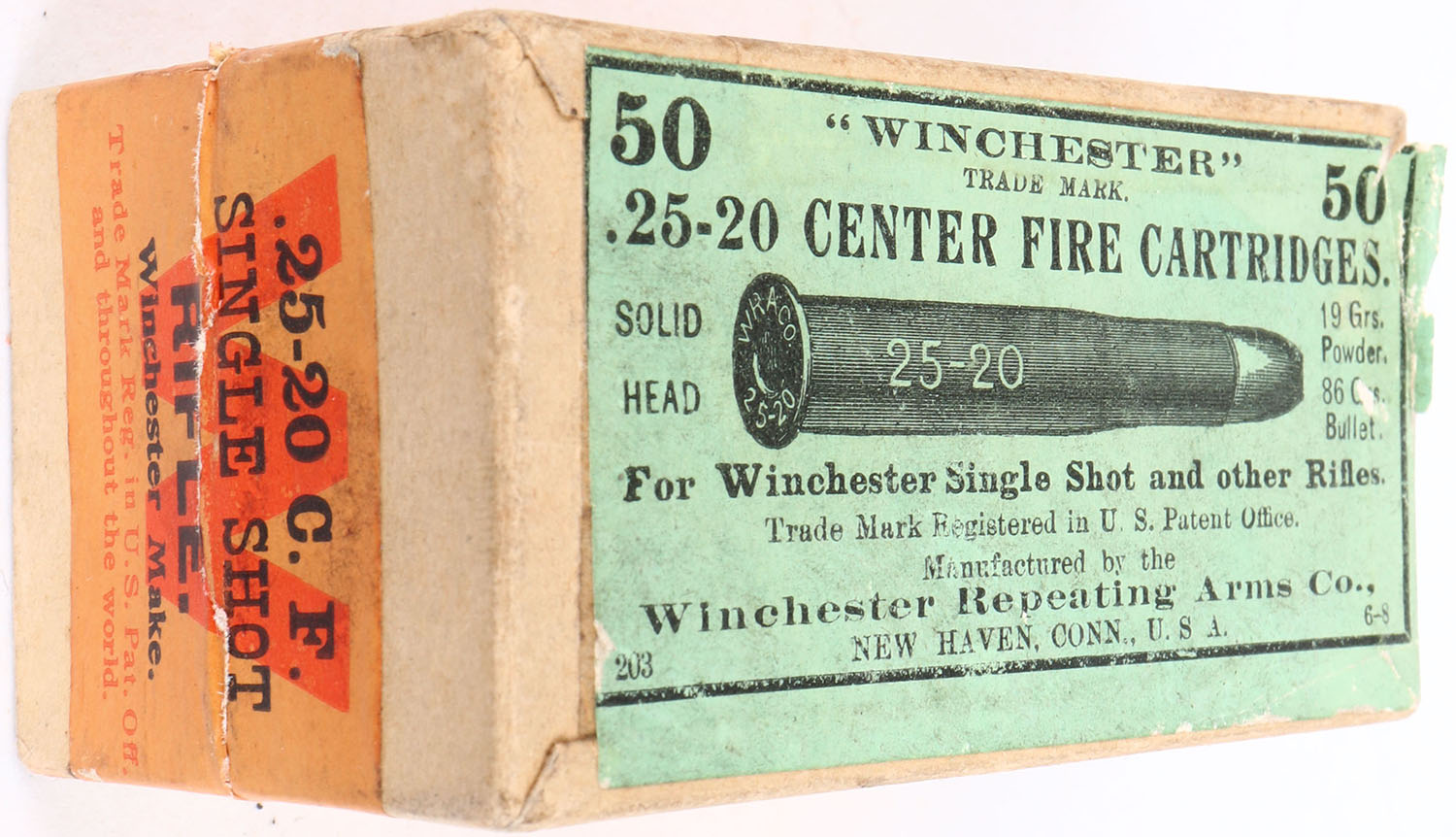 Winchester, .25-20 Caliber Center Fire Single Shot, 86 Grain Bullet, Full & Sealed, 2pc. Buff box with orange and green labels, box is solid, some age soiling to labels. Grade: Excellent - Value: 200 to 500