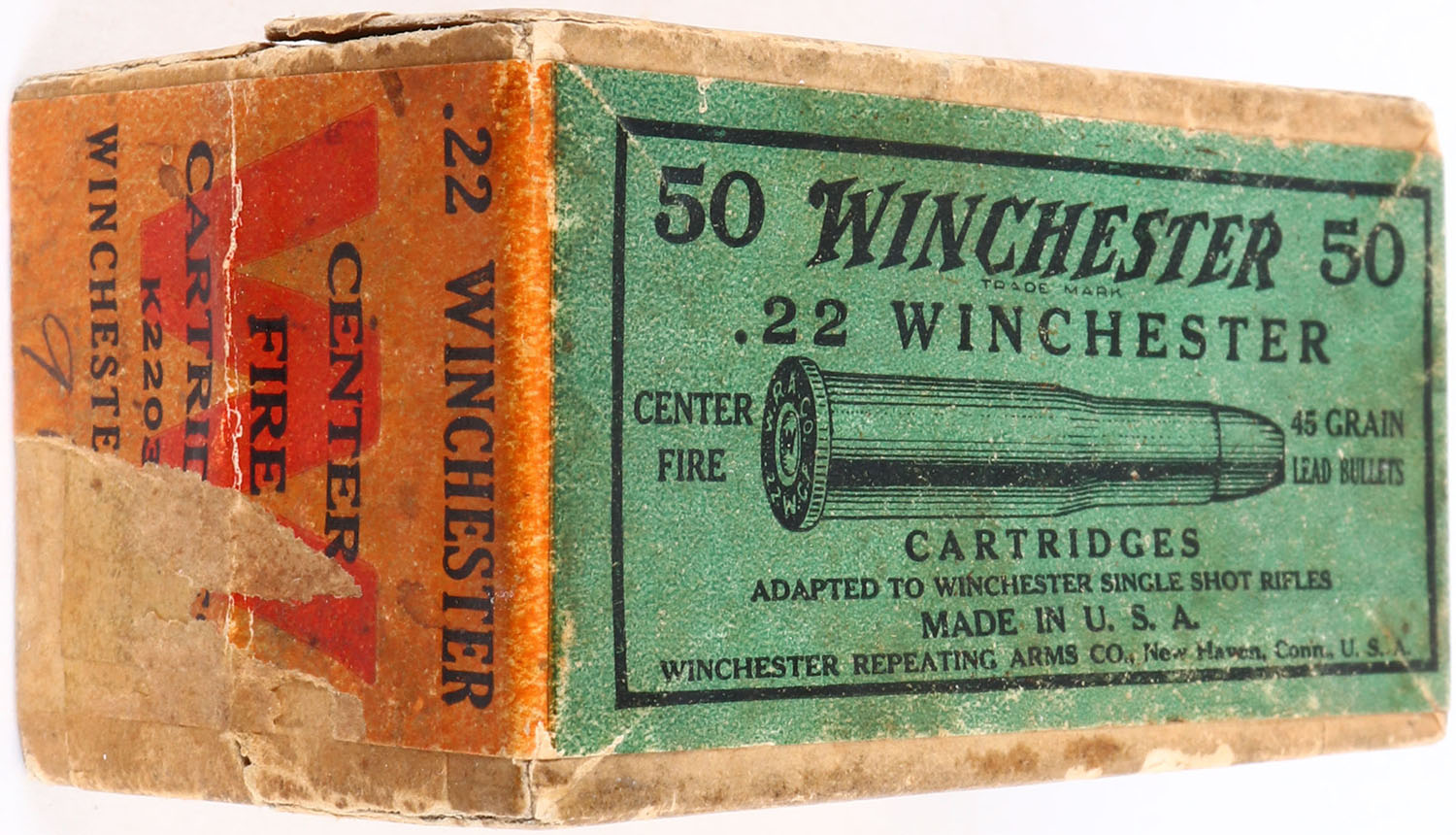Winchester, .22 Winchester, 45 Grain Bullet, Full, 2pc. Buff box with orange and green labels, box has age soiling and 1 corner ding, some age soiling and scuffing to labels, ammo is very good to excellent. Grade: Very Good - Value: 50 to 150