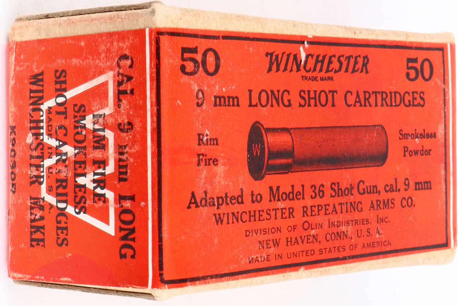 Winchester, 9mm Long Shot Cartridges, Rim Fire, FULL & SEALED, 2pc. Buff box with red wraparound label, box is solid with excellent to minty color, very minor shelf wear, edges are crisp, corners are mostly sharp, labels are intact. Grade: Excellent ++ - Value: 100 to 300