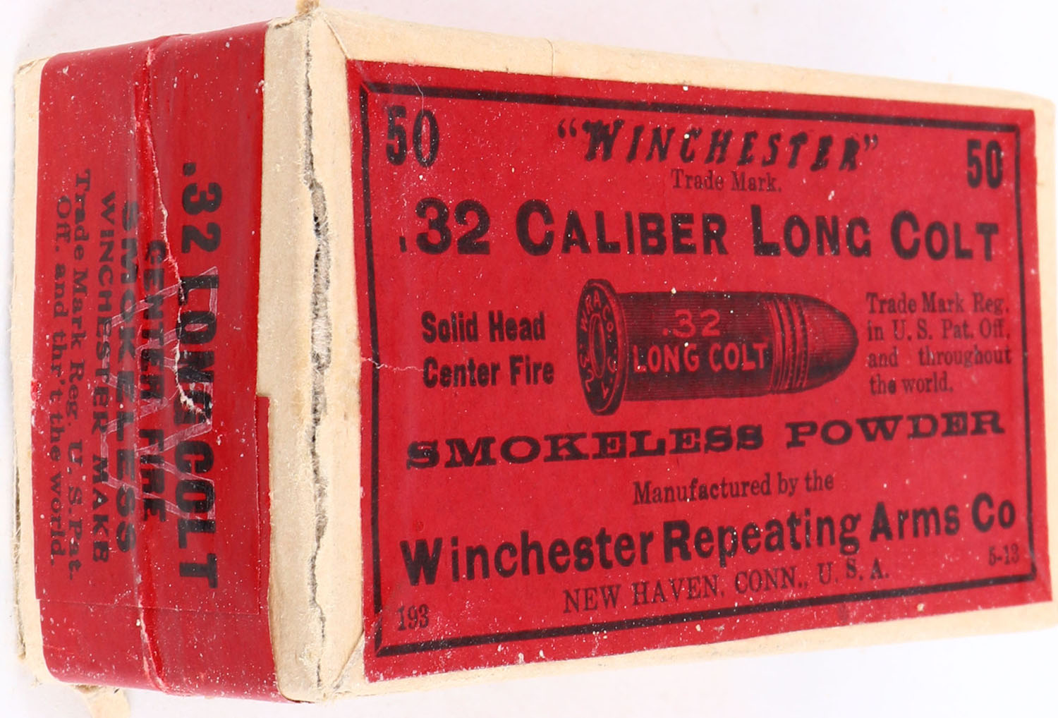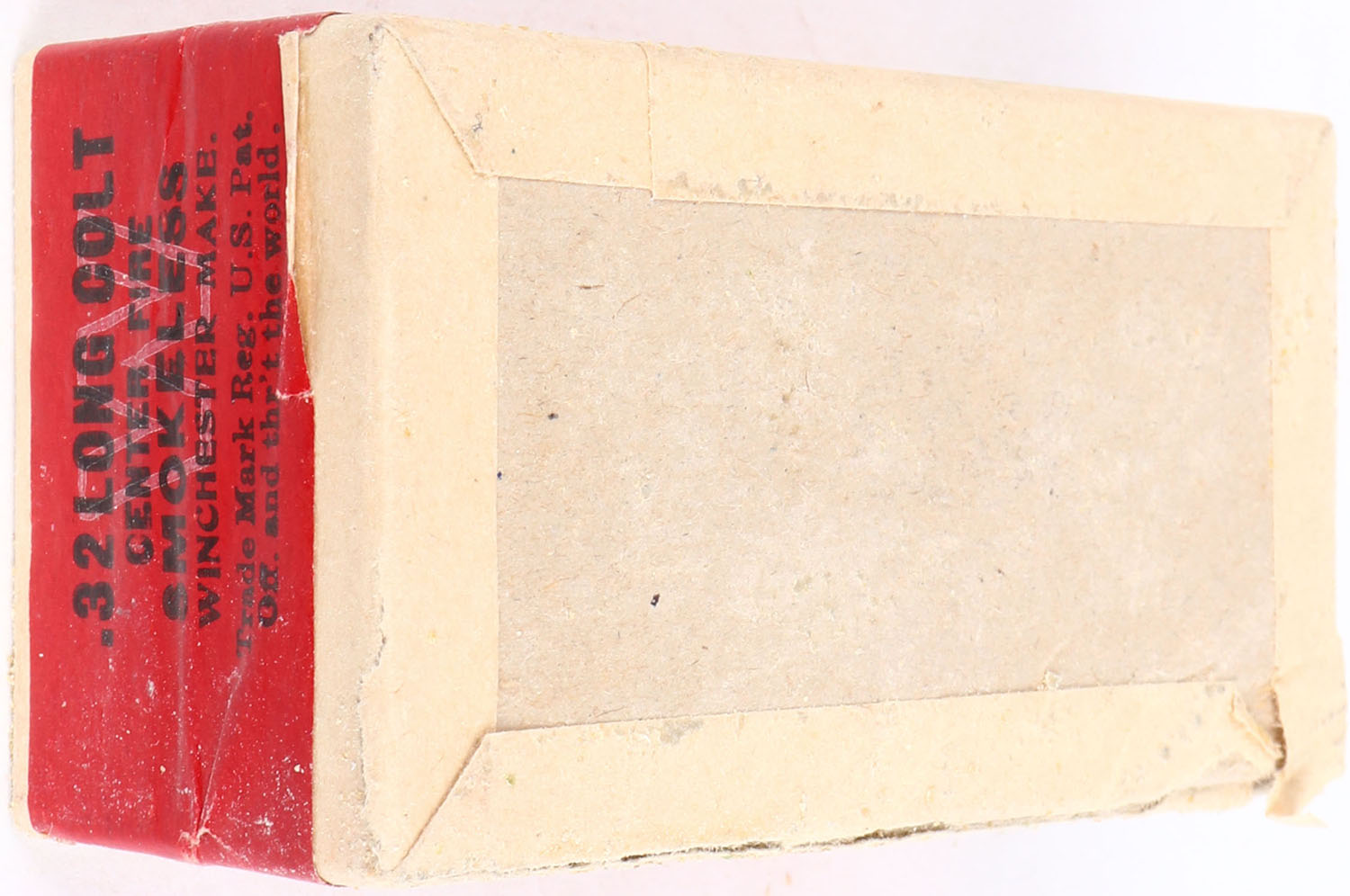 Winchester, .32 Long Colt, Smokeless Powder, FULL & SEALED, 2pc. Buff box with red top & side sealing labels, box is solid with minty color, 2 seam splits on bottom on front & left end, seam split on top left end, edges are otherwise crisp, corners are sharp, labels are intact, ammo appears good. Grade: Very Good + - Value: 20 to 100