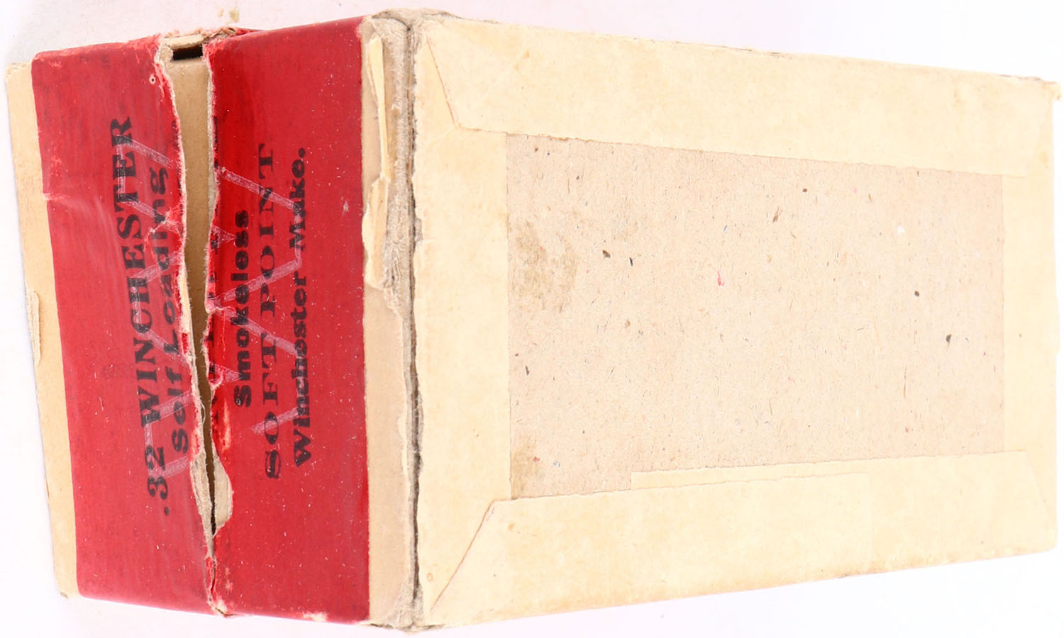 Winchester, .32 Winchester Self Loading, 165 Grain Metal Patched Soft Point Bullets, FULL & SEALED, 2pc. Buff box with red top & side sealing labels, box is solid with excellent color, vertical seam split to back right corner of lid, seam split to bottom right edge, minor corner wear, edges are mostly crisp, labels are intact. Grade: Very Good + - Value: 50 to 200