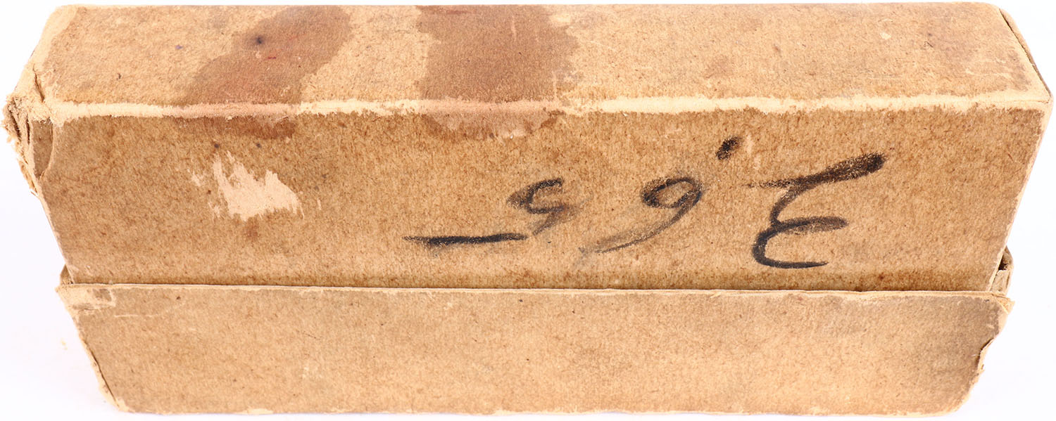Winchester, Staynless, .50-110-300 Winchester Smokeless Soft Point, Full, 2pc. Buff box with orange labels and ''Staynless'' Over-Stamp, box is solid with very good color, age soiling, some color fading to top, 2 vertical seam splits to right end of lid, one has been repaired, some shelf wear, edge & corner wear, back has been written on, labels are intact, ammo is excellent. Grade: Excellent - Value: 100 to 300
