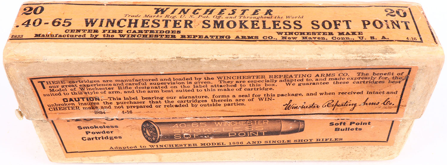 Winchester, .40-65 Winchester, Smokeless, 260 Gr, Soft Point Bullets, FULL & SEALED, 2pc. Buff box with orange labels, box is solid with excellent color, some age soiling, minor staining to front & back, minor edge & corner wear, labels are intact. Grade: Excellent + - Value: 150 to 300