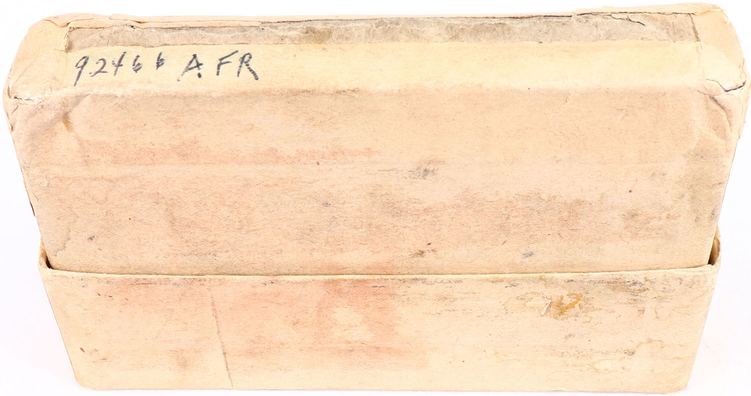 Winchester, 8mm Mauser or Mannlicher, 236 Grs. Soft Point Bullet, Adapted to Mauser and Mannlicher Rifles, Full, 2pc. Buff box with orange labels, box is solid, with very good to excellent color, some age soiling & shelf wear, partial seam splits to both ends of bottom, staining to back side, minor edge & corner wear, bottom has been written on, ammo is good to very good. Grade: Very Good ++ - Value: 30 to 90