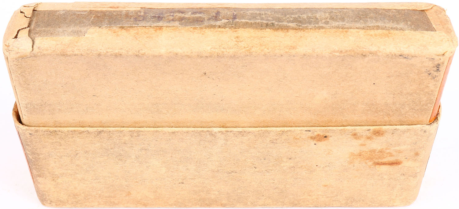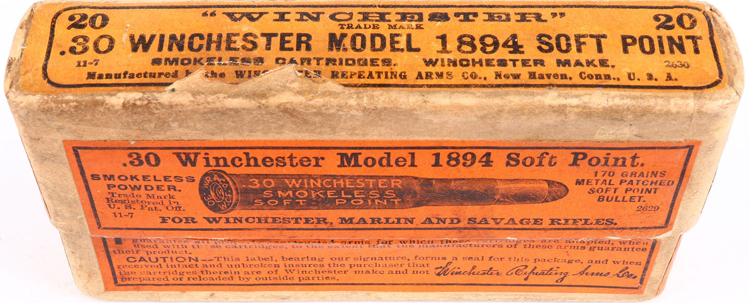 Winchester, .30 Winchester Model 1894 Soft Point, 170 Grains Metal Patched Soft Point Bullet, Full, 2pc. Buff box with orange labels, box is solid with excellent color, some age soiling, very minor shelf wear, labels are 99% intact, ammo is very good to excellent. Grade: Excellent + - Value: 10 to 150