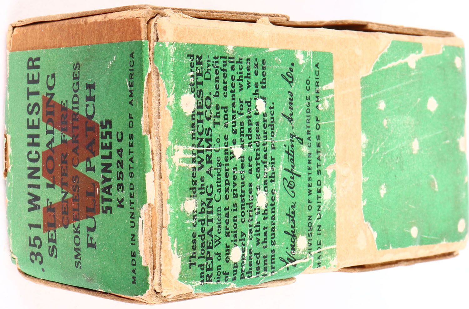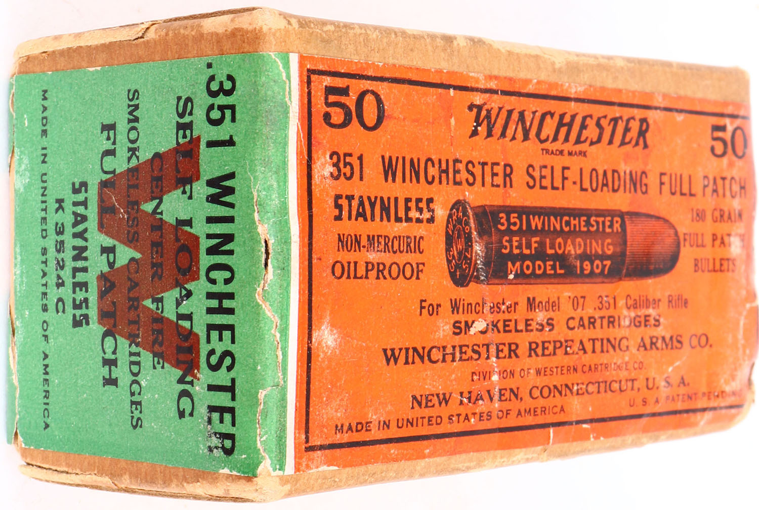 Winchester, Staynless, .351 Winchester Self-Loading, 180 Grain Full Patch Bullets, Full, 2pc. Buff box with orange & green wraparound label, box is solid with excellent color, some age soiling, seam split on top right edge, some edge & corner wear, label is intact, ammo is excellent. Grade: Very Good ++ - Value: 100 to 200