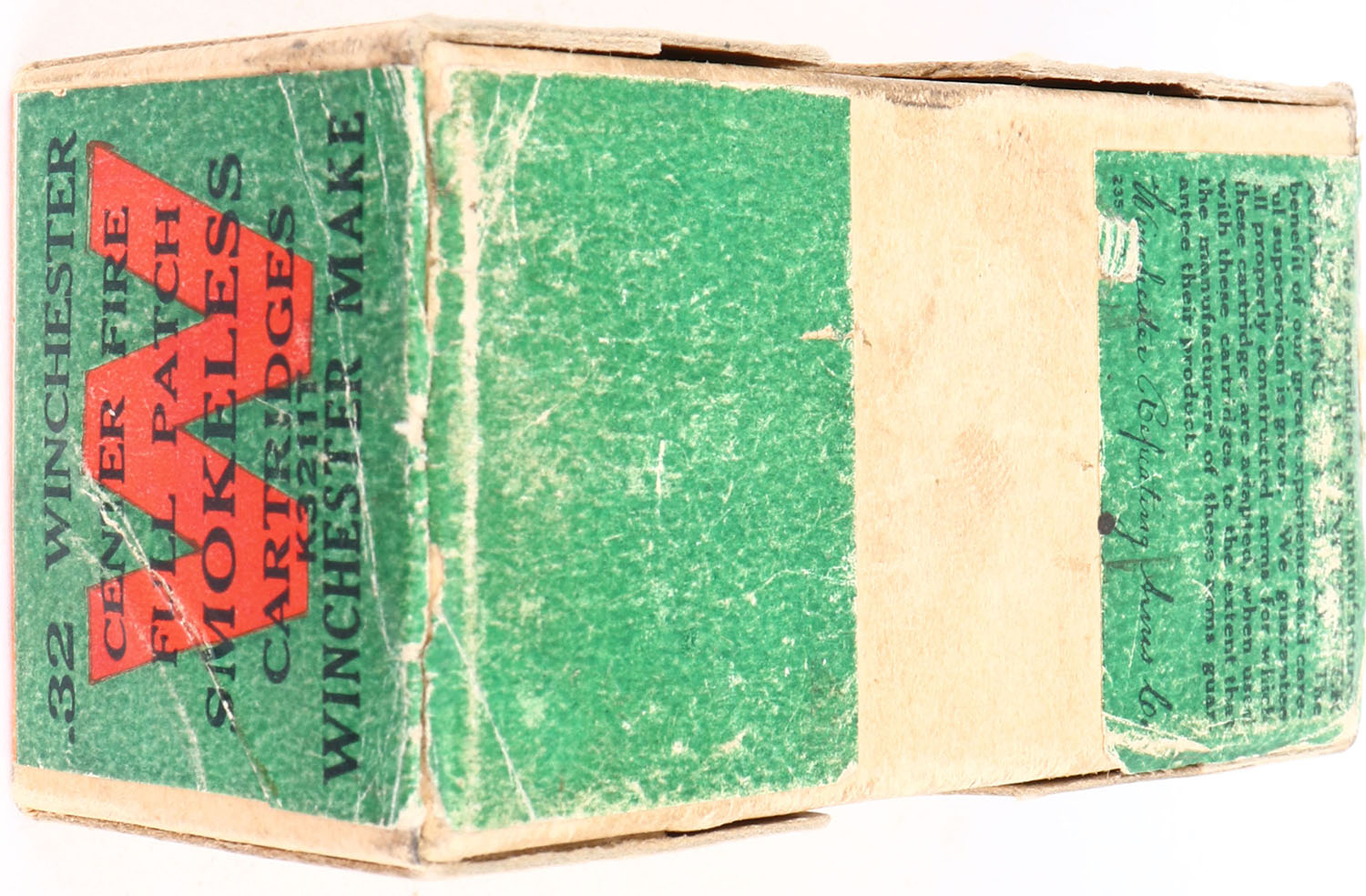 Winchester, .32 Winchester, Smokeless Cartridges, 115 Grain Full Patch Bullets, Full, 2pc. Buff box with orange & green wraparound label, box is solid with excellent color, minor age soiling & shelf wear, very minor edge & corner wear, back side has been written on, label is intact, ammo is excellent. Grade: Excellent + - Value: 30 to 90