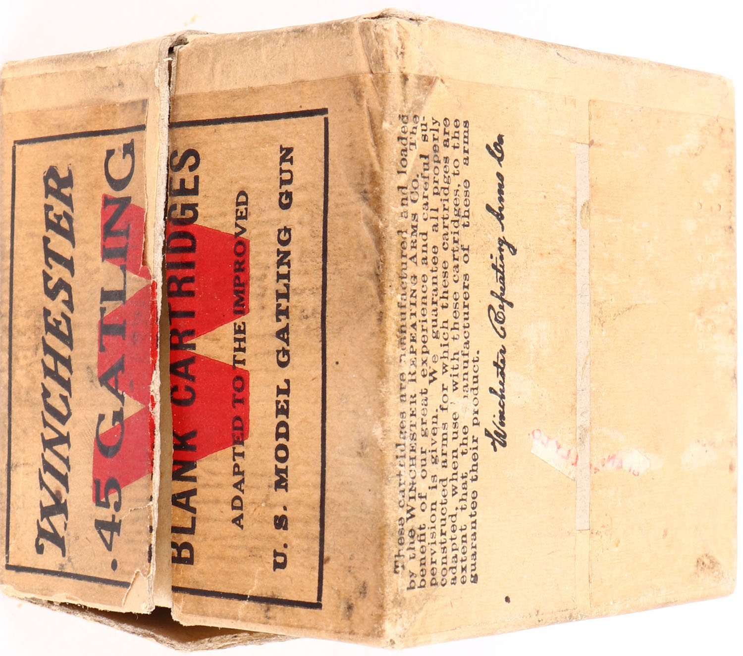 Winchester, .45 Gatling Blank Cartridges, Full, 2pc. Buff box with buff wraparound label & white over-label, box is solid with very good color, age soiling, vertical seam splits to 3 corners of lid, some edge & corner wear, label is 95% intact, ammo is very good to excellent. Grade: Very Good + - Value: 20 to 80