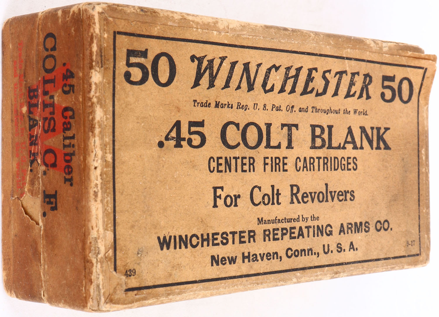 Winchester, .45 Colt Blank, For Colt Revolvers, Full, 2pc. Buff box with buff top & side sealing labels, box is solid with very good color, age soiling, some edge & corner wear, bottom has been written on, ammo is very good to excellent. Grade: Excellent - Value: 20 to 80